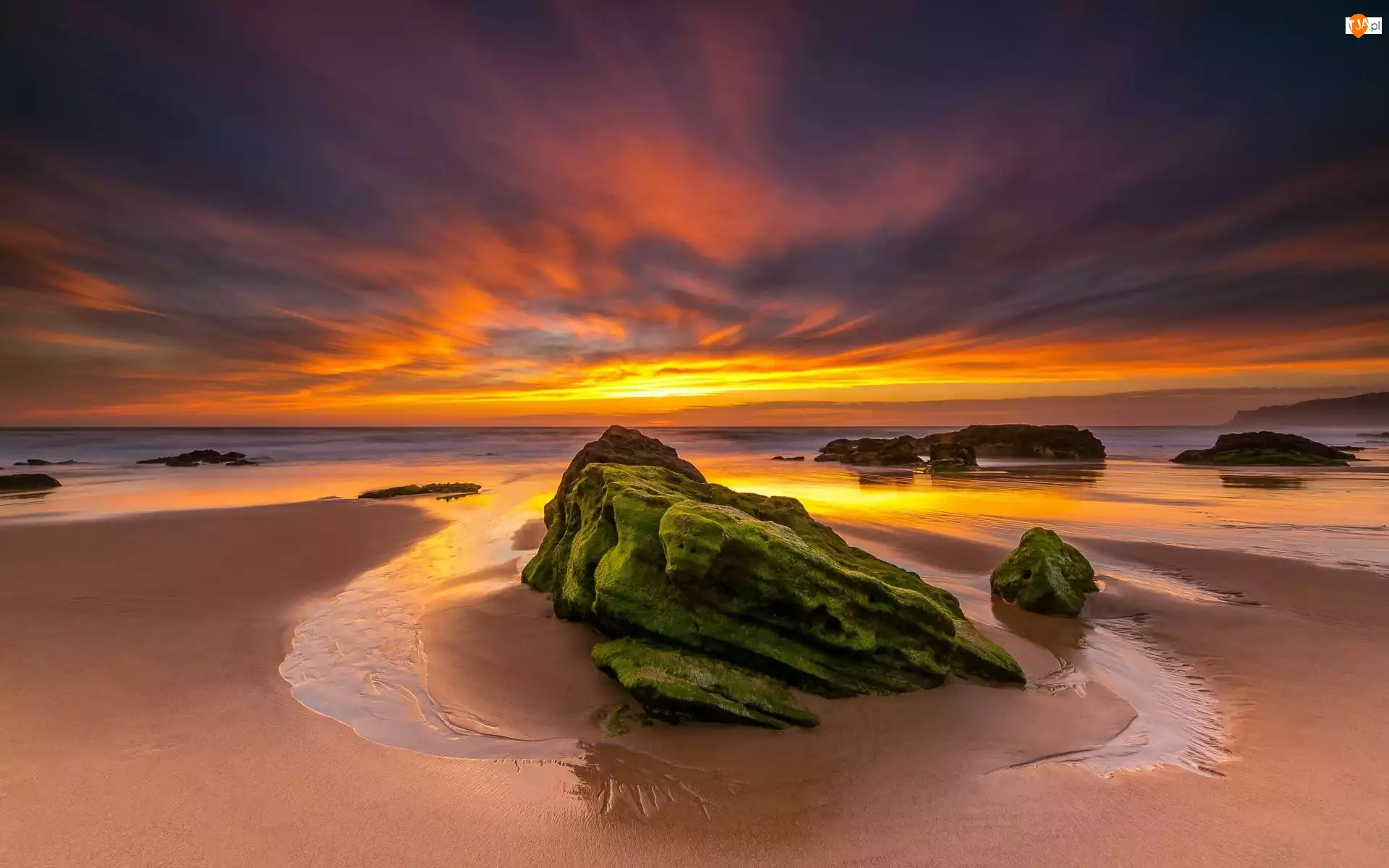 Morze, Zachód słońca, Portugalia, Chmury, Plaża Cresmina beach, Skały