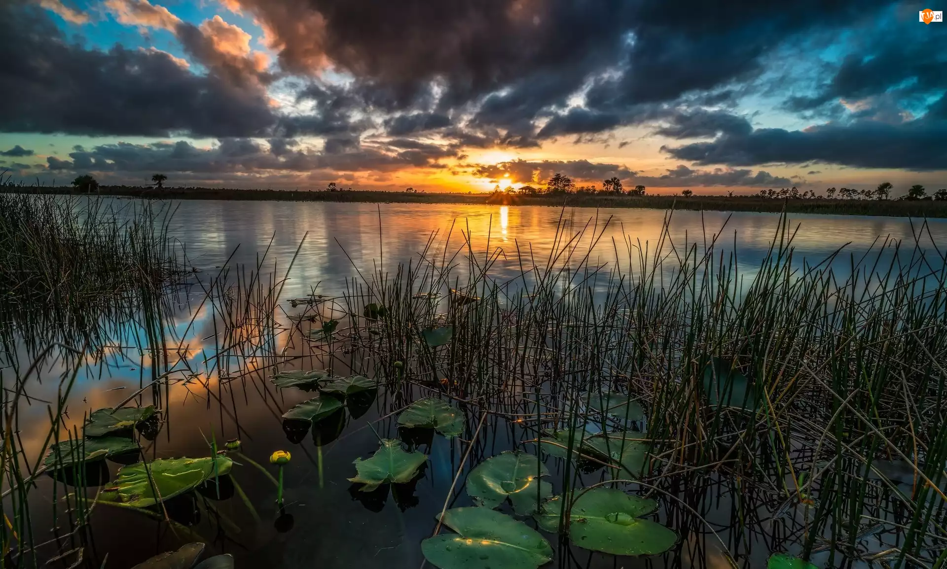 Rzeka, Zachód słońca, Rośliny, Chmury