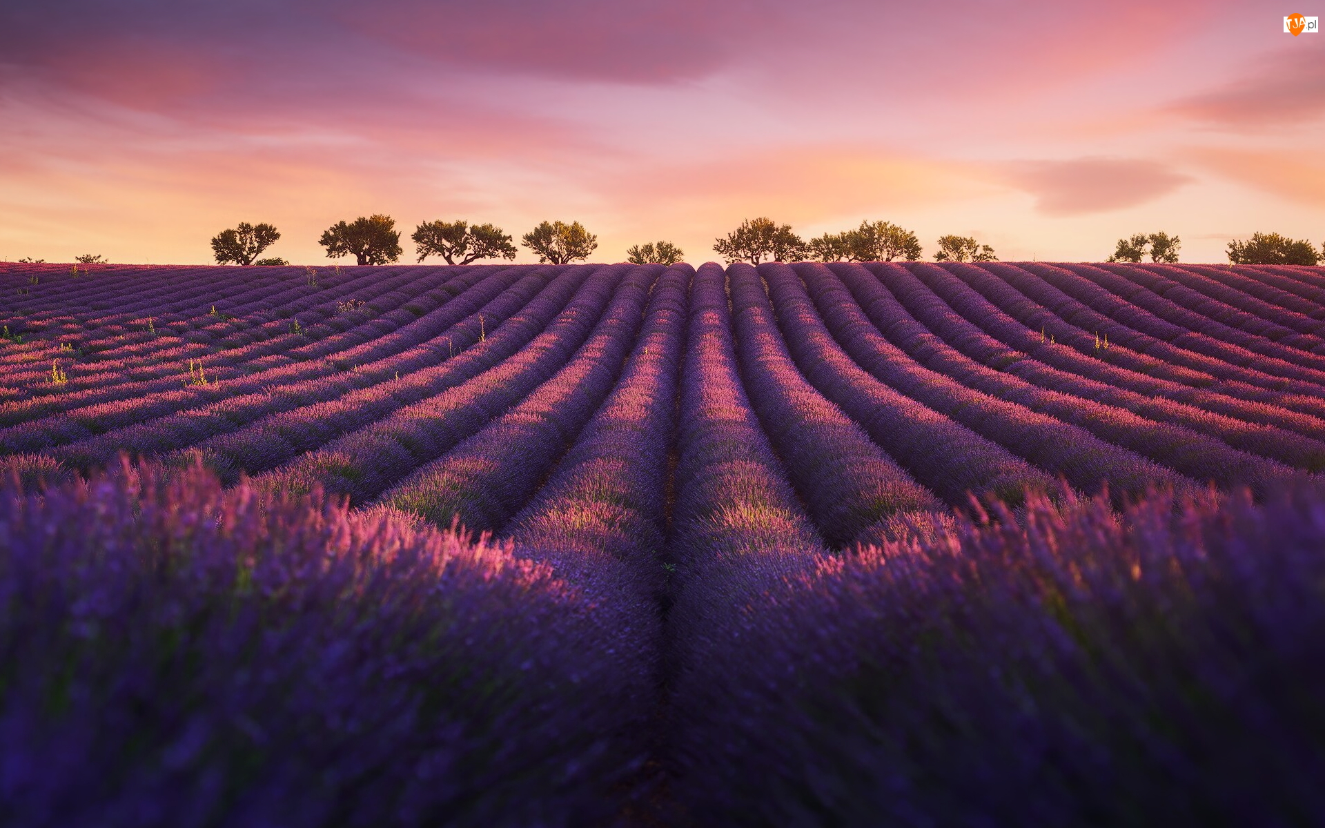 Drzewa, Niebo, Lawenda, Pole, Zaróżowione