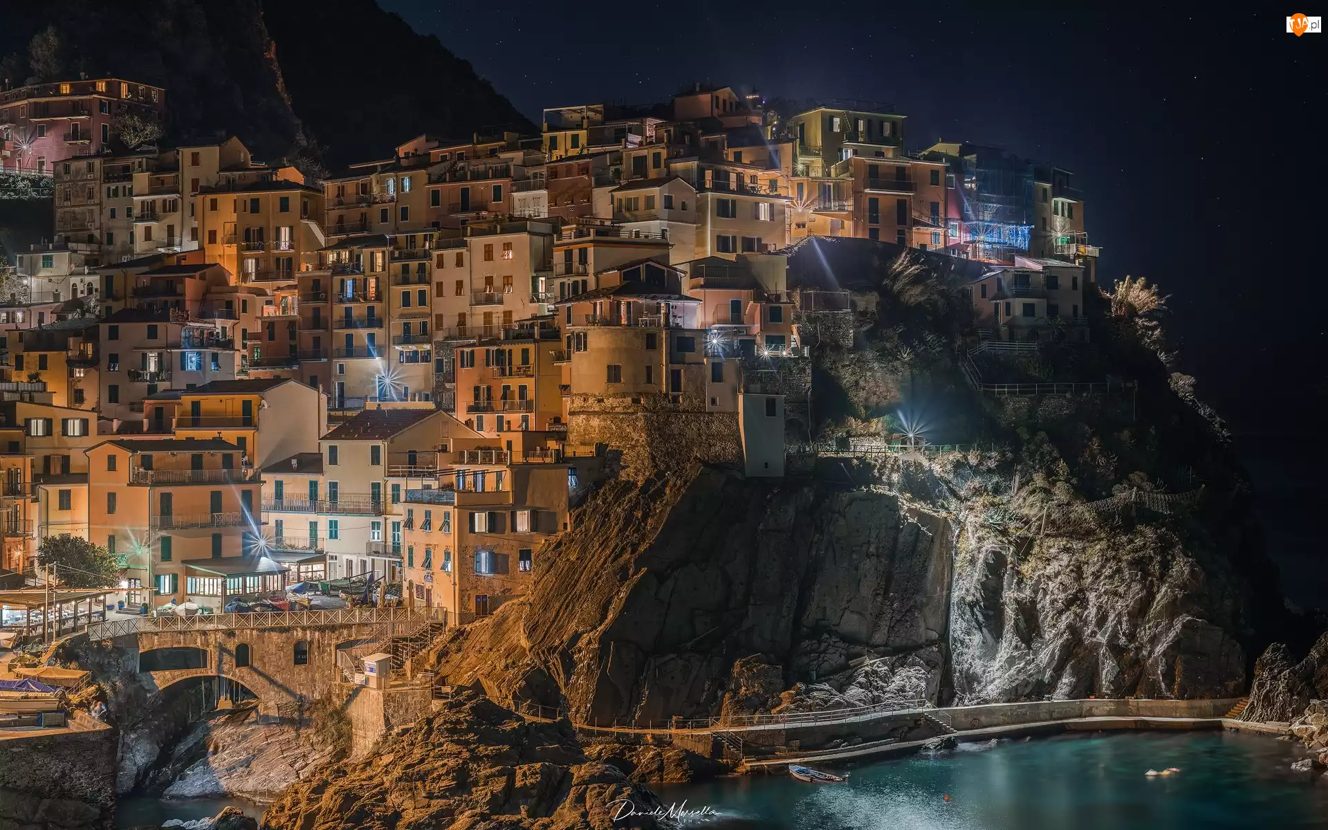 Cinque Terre, Manarola, Domy, Włochy, Miasto nocą, Skały, Morze