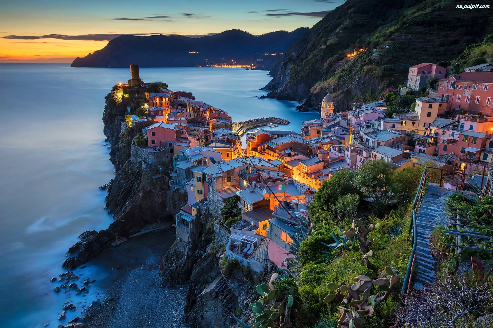 Morze, Domy, Cinque Terre, Włochy, Noc, Vernazza, Góry