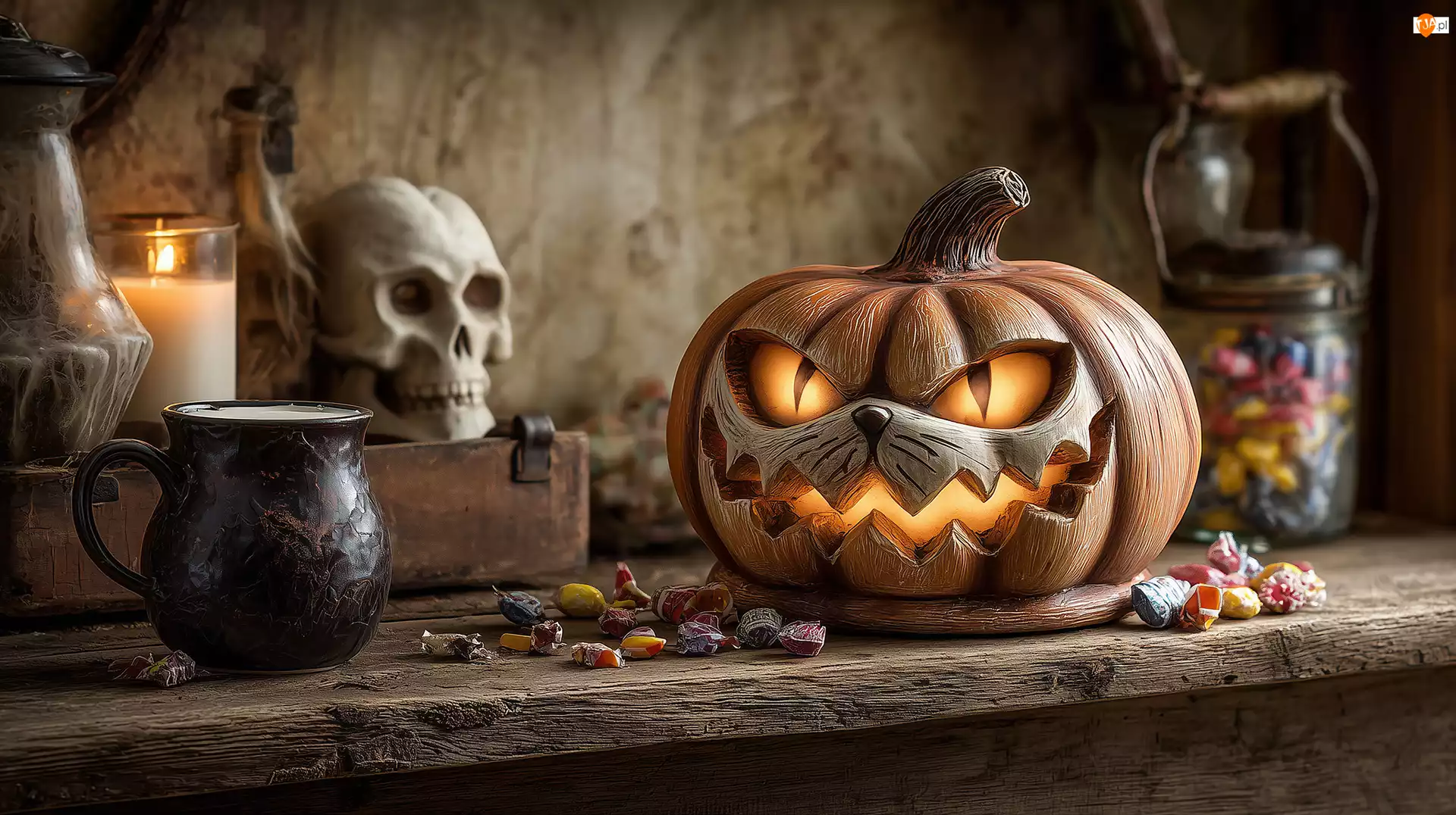 Cukierki, Grafika AI, Kubek, Dynia, Halloween