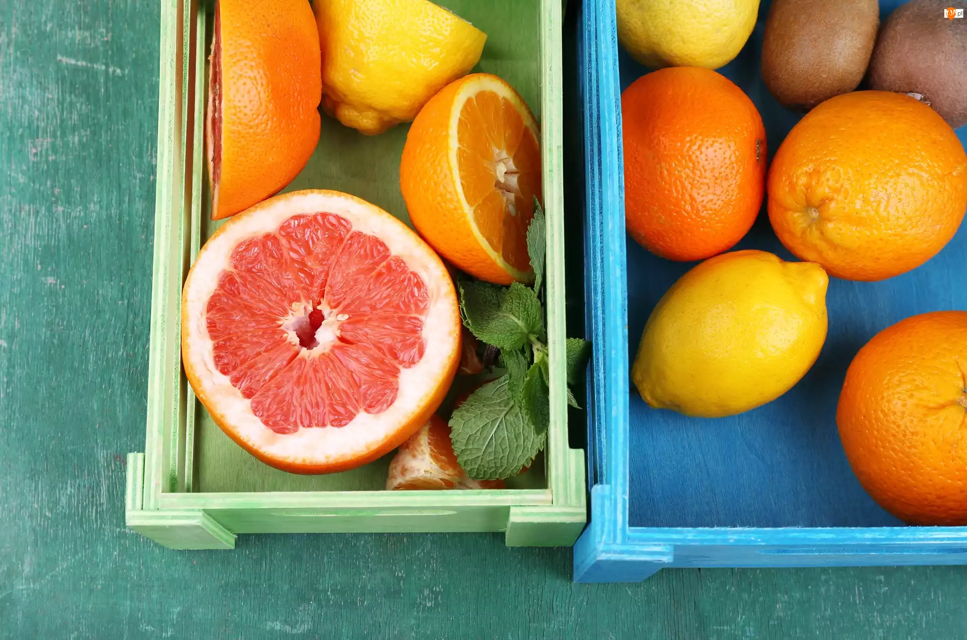Cytrusy, Grejpfrut, Skrzynki, Owoce, Listki, Cytryny, Pomarańcze