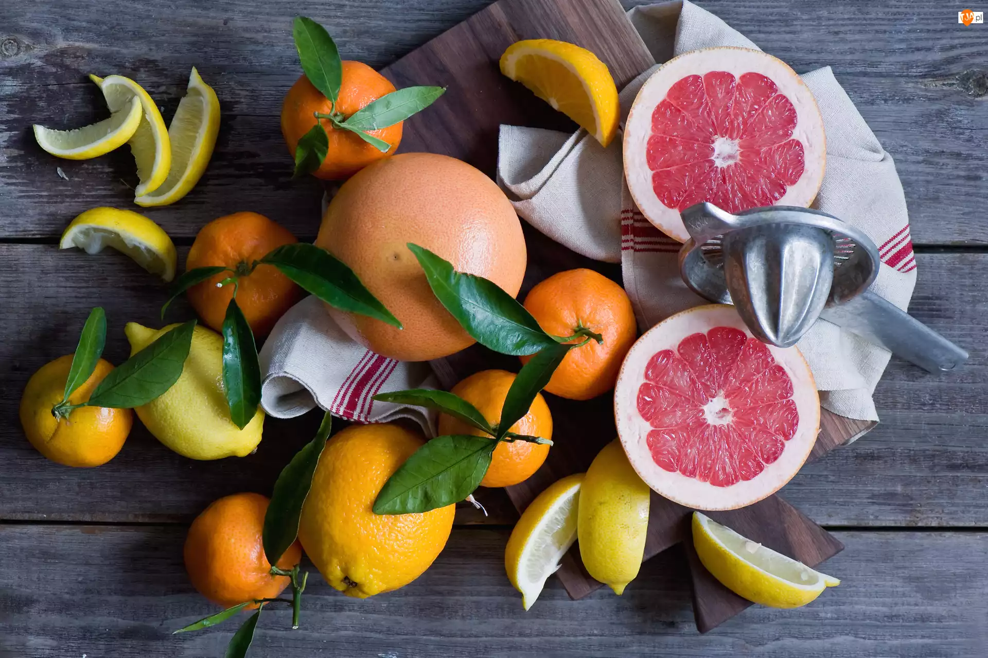 Grejpfruty, Cytryny, Deski, Listki, Owoce, Wyciskarka, Mandarynki, Kompozycja, Deska, Cytrusy, Ściereczki
