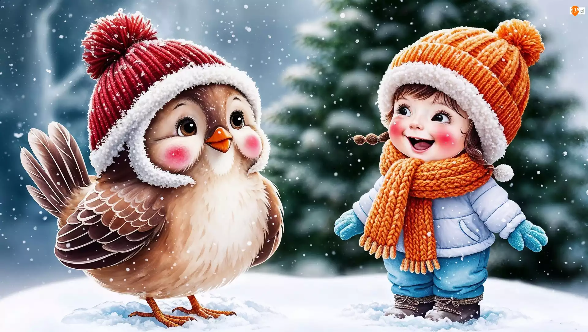 Czapka, Grafika, Ptak, Dziewczynka, Zima