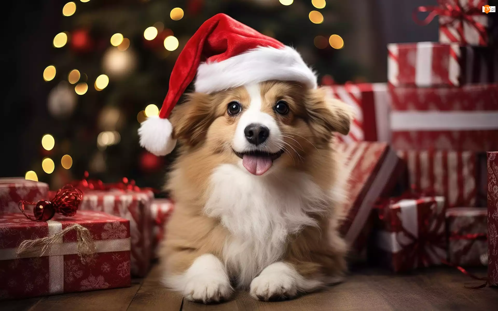 Czapka, Prezenty, Szczeniak, Pies, Mikołaja
