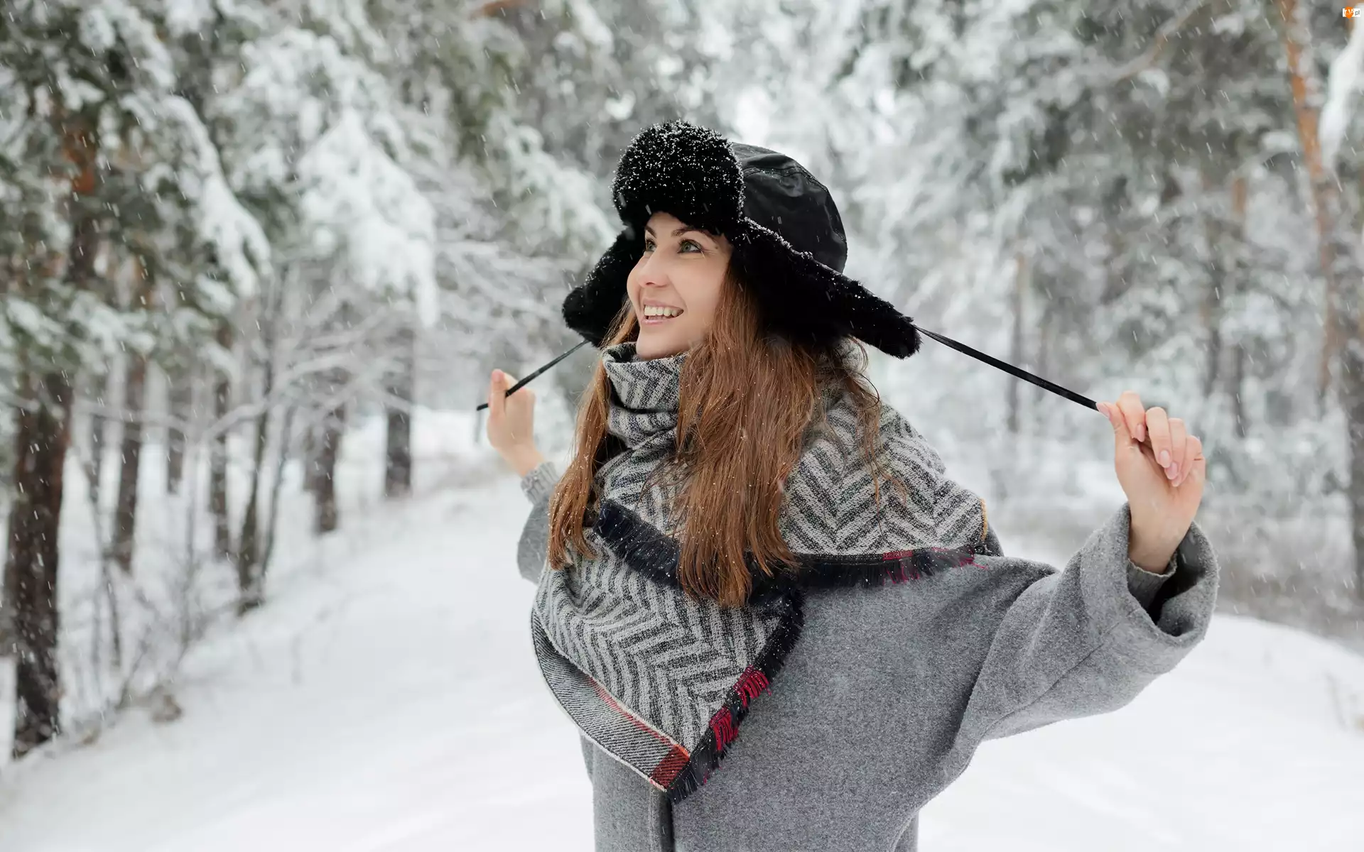 Czapka, Zima, Kobieta, Uśmiechnięta, Szal