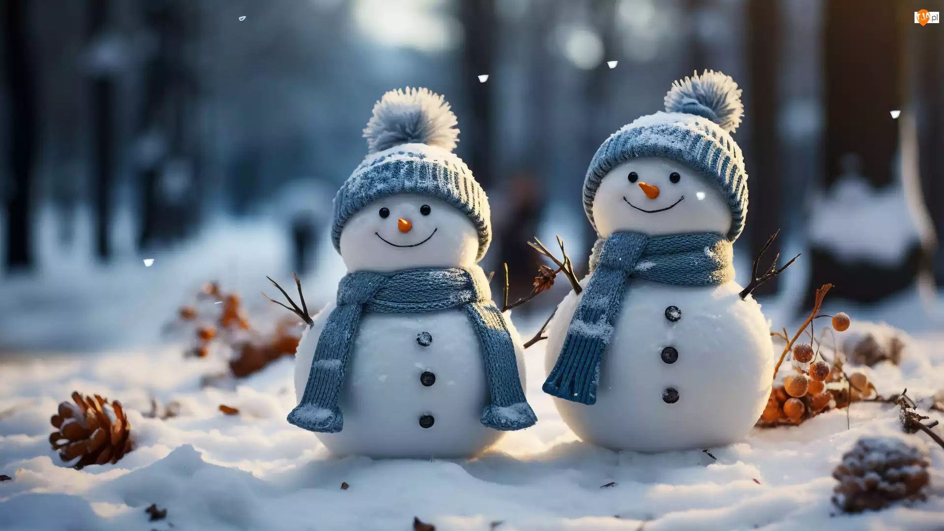 Czapki, Śnieg, Bałwanki, Dwa, Szaliki