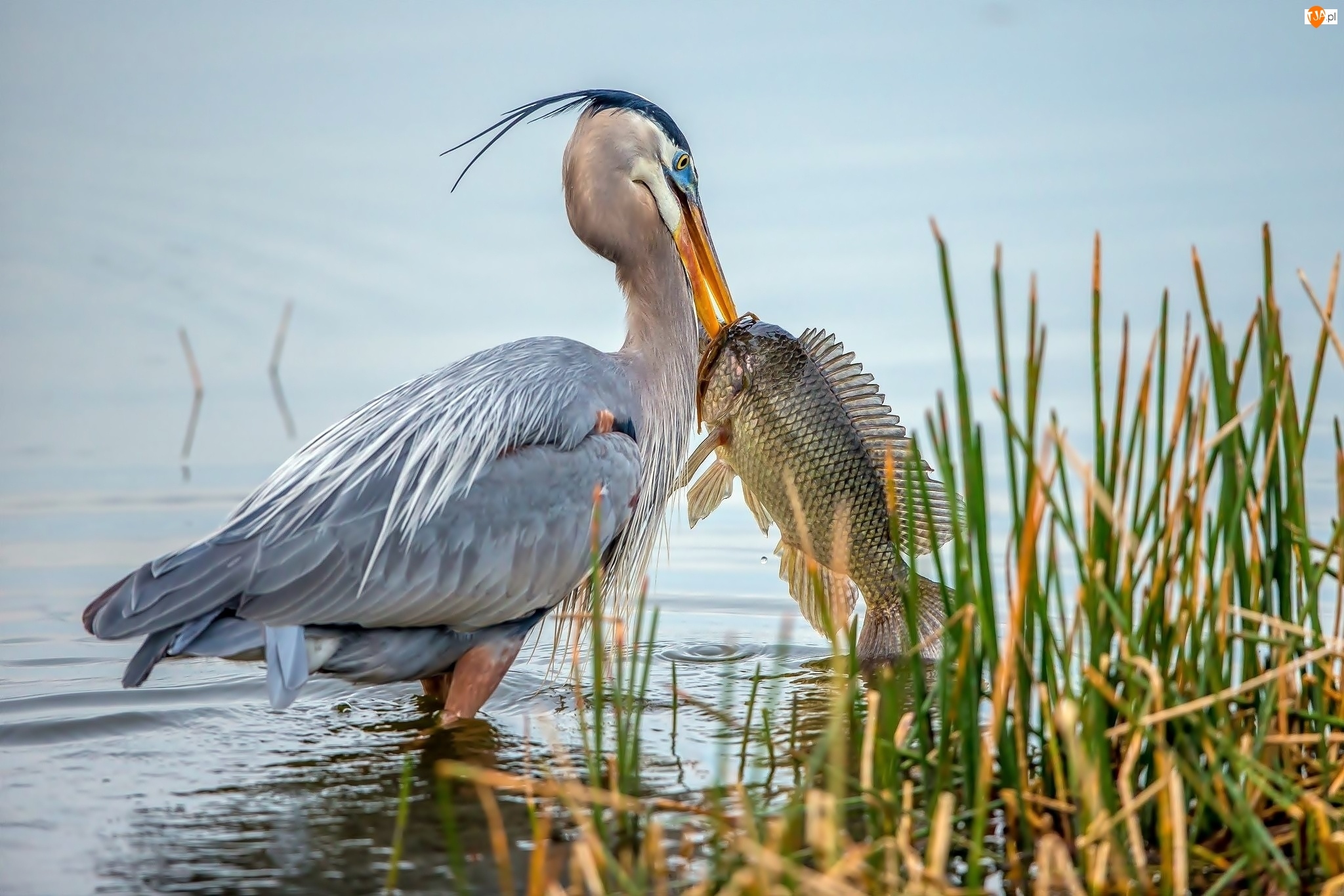 Jezioro, Czapla, Rybka, Trawa