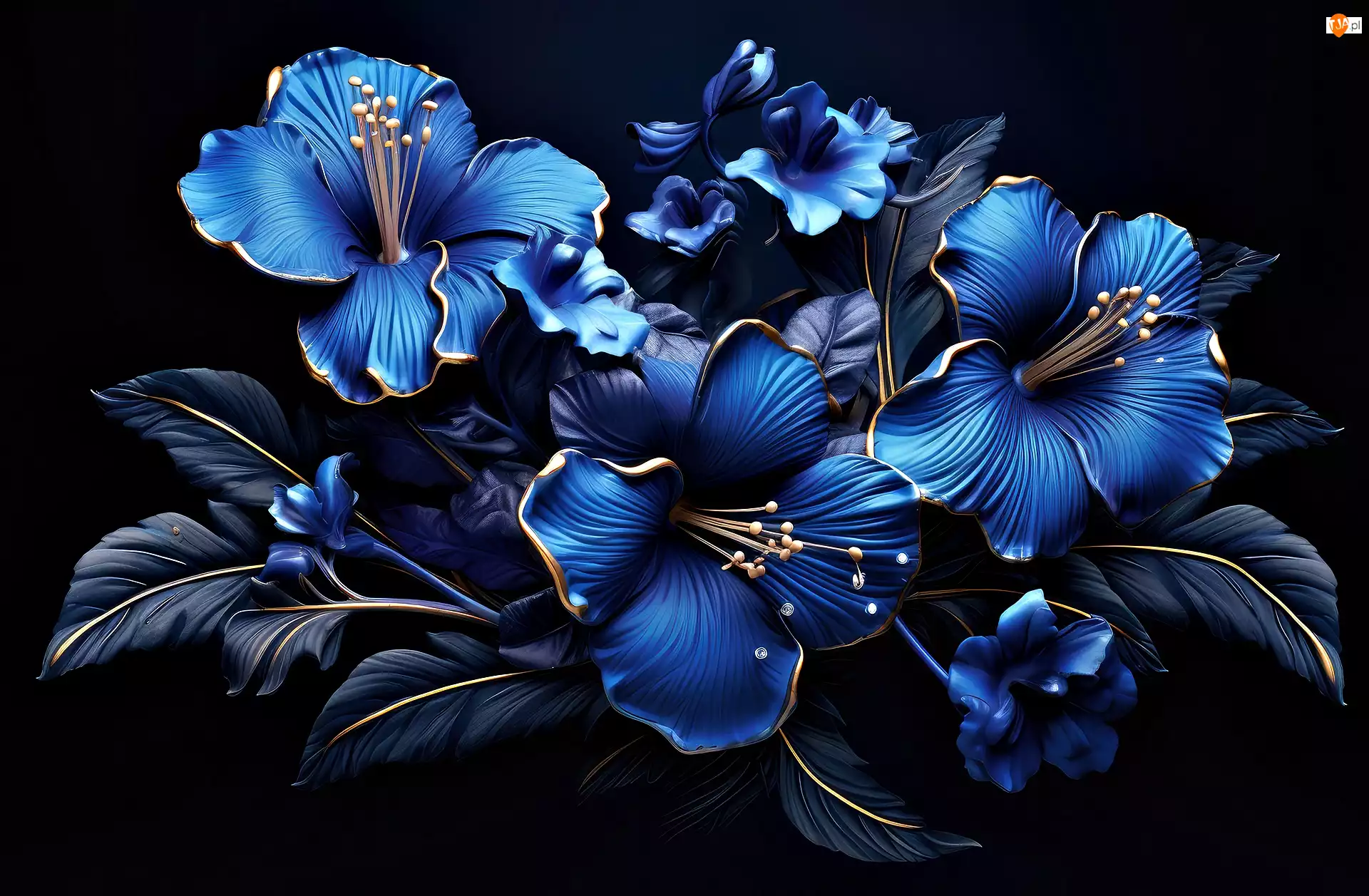 Czarne, Grafika, Kwiaty, Niebieskie, Tło
