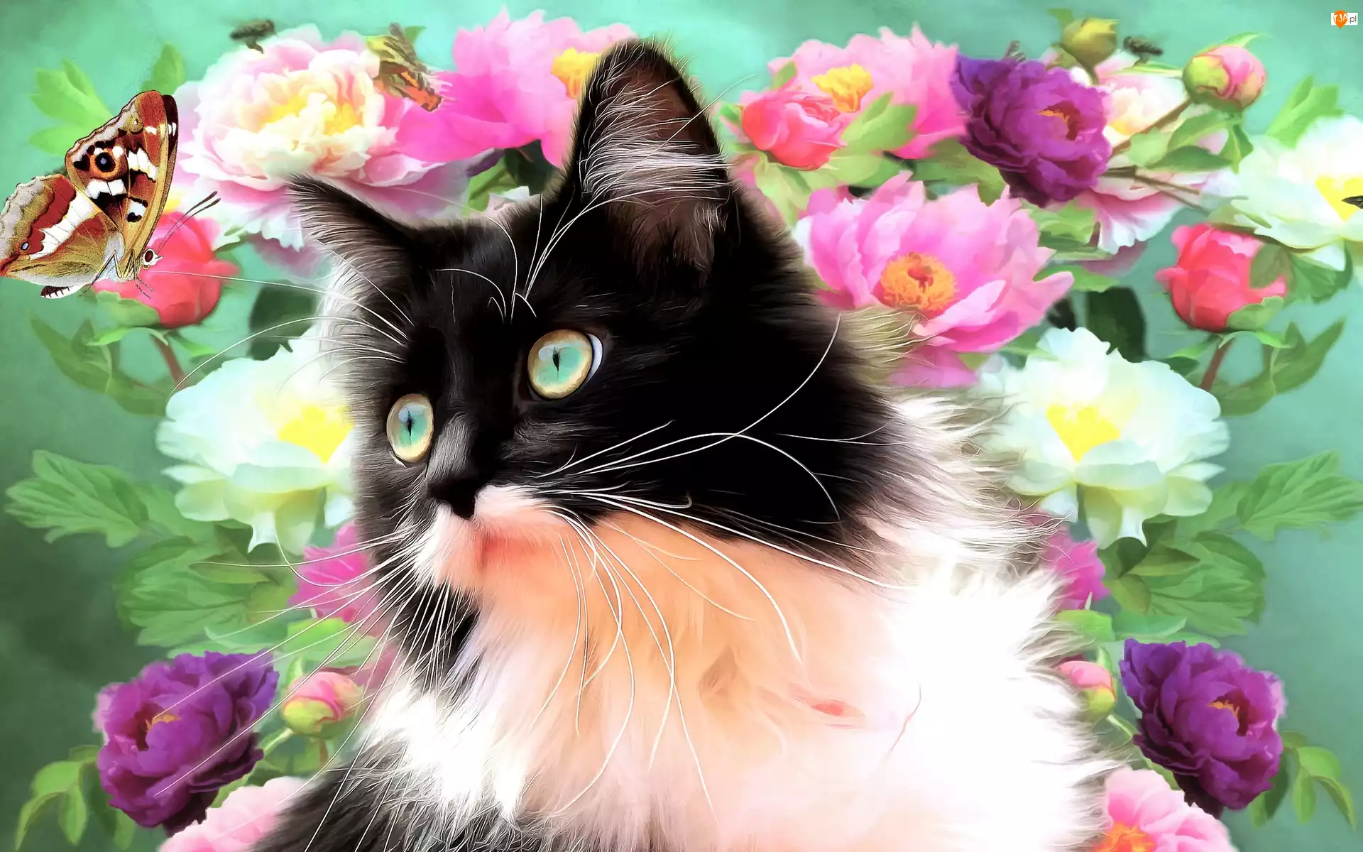 Grafika, Kot, Kwiaty, Motylki