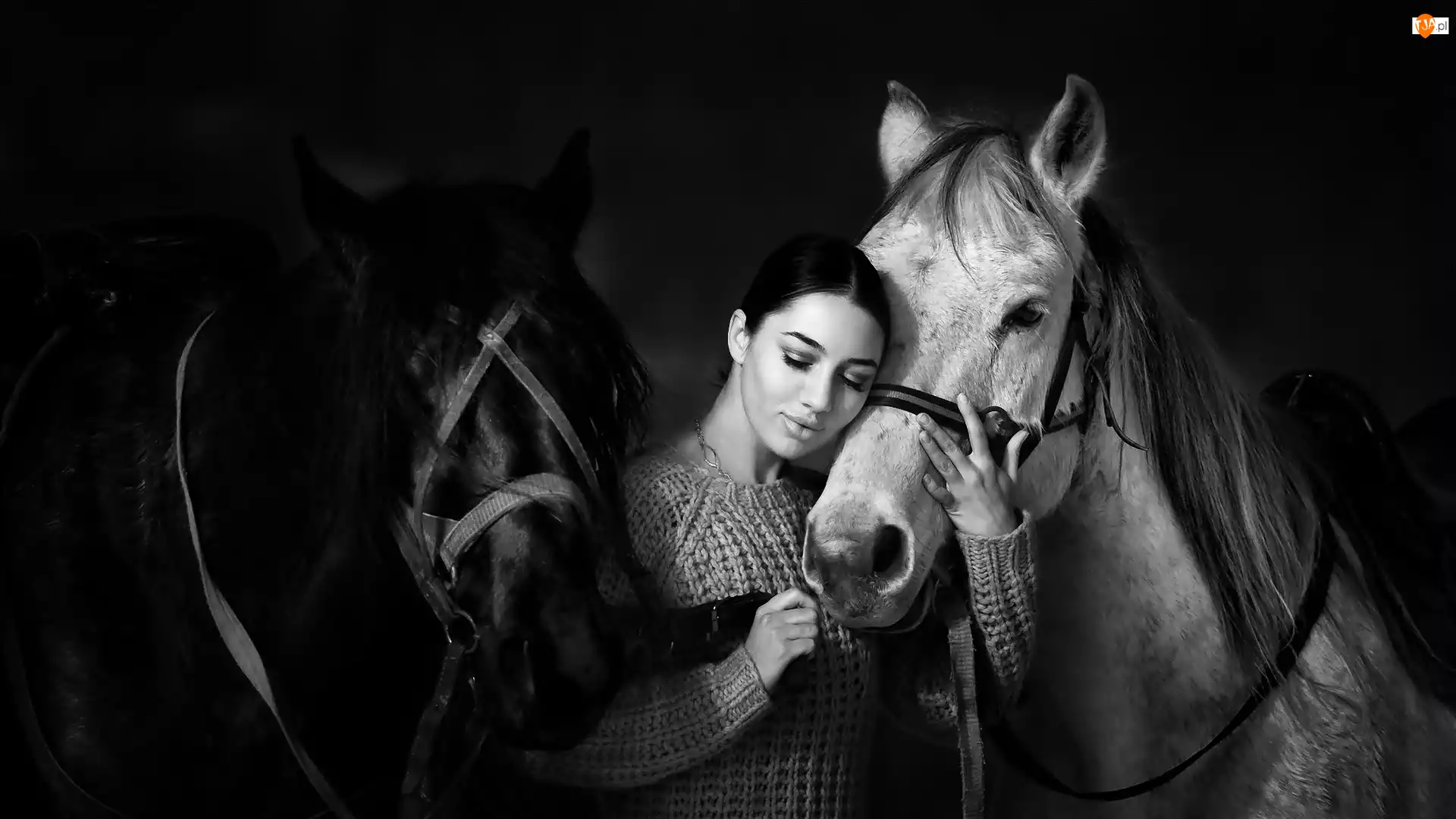 Czarno-biały portret kobiety z końmi
