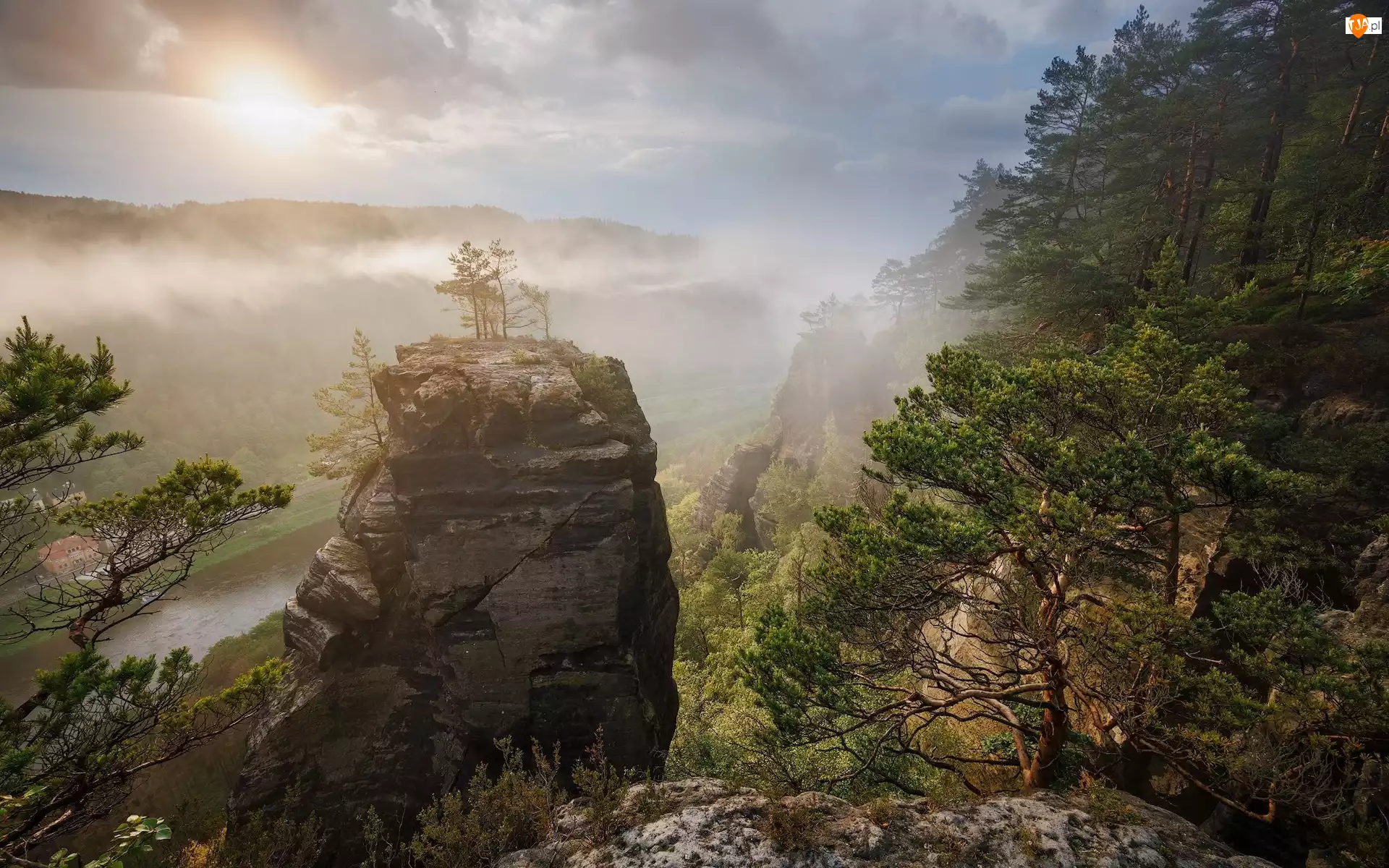 Czechy, Połabskie, Labska Stran, Mgła, Drzewa, Rzeka, Łaba, Góry, Skały