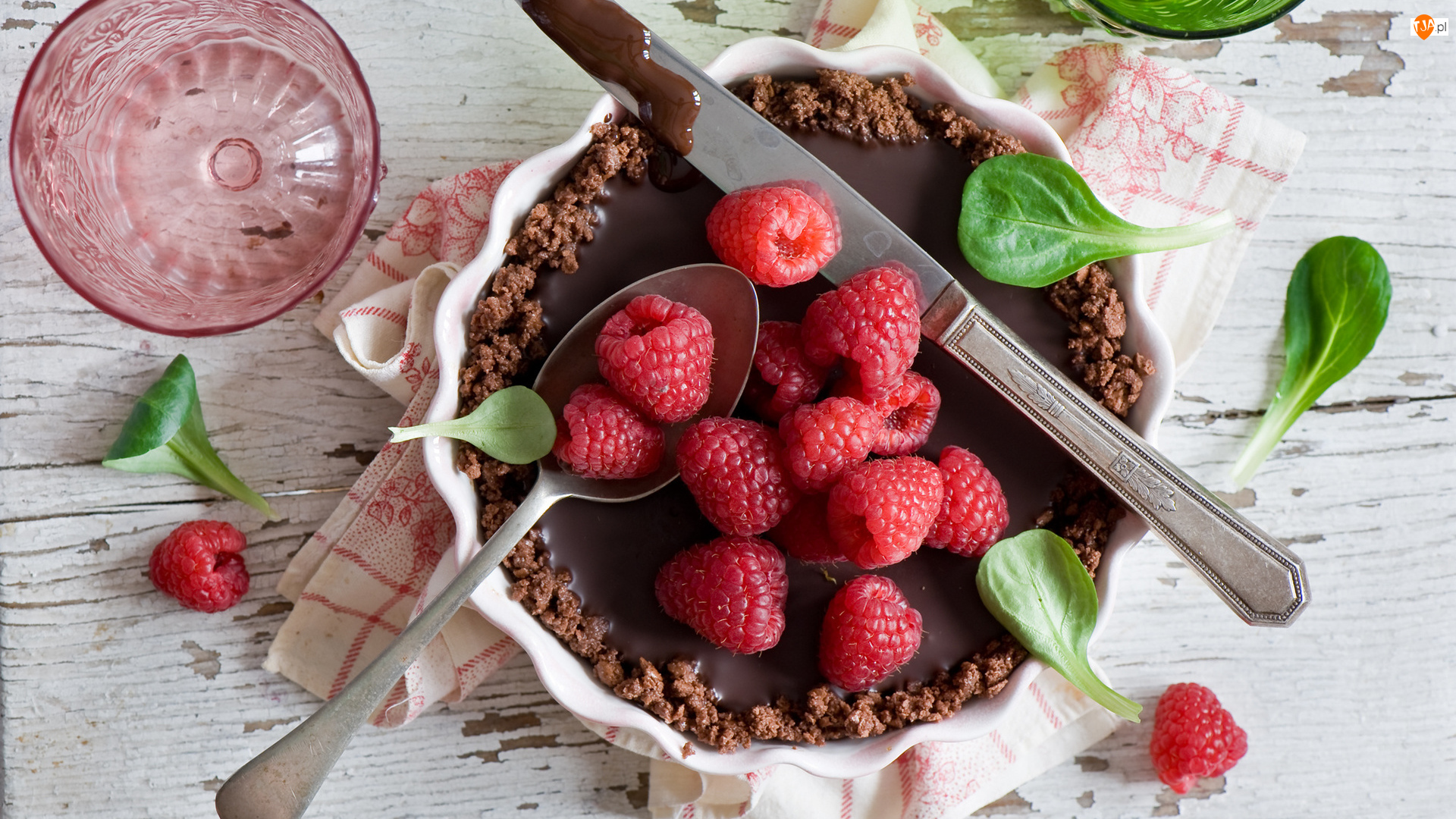 Czekoladowy, Maliny, Listki, Deser, Szklanka, Nóż, Łyżka