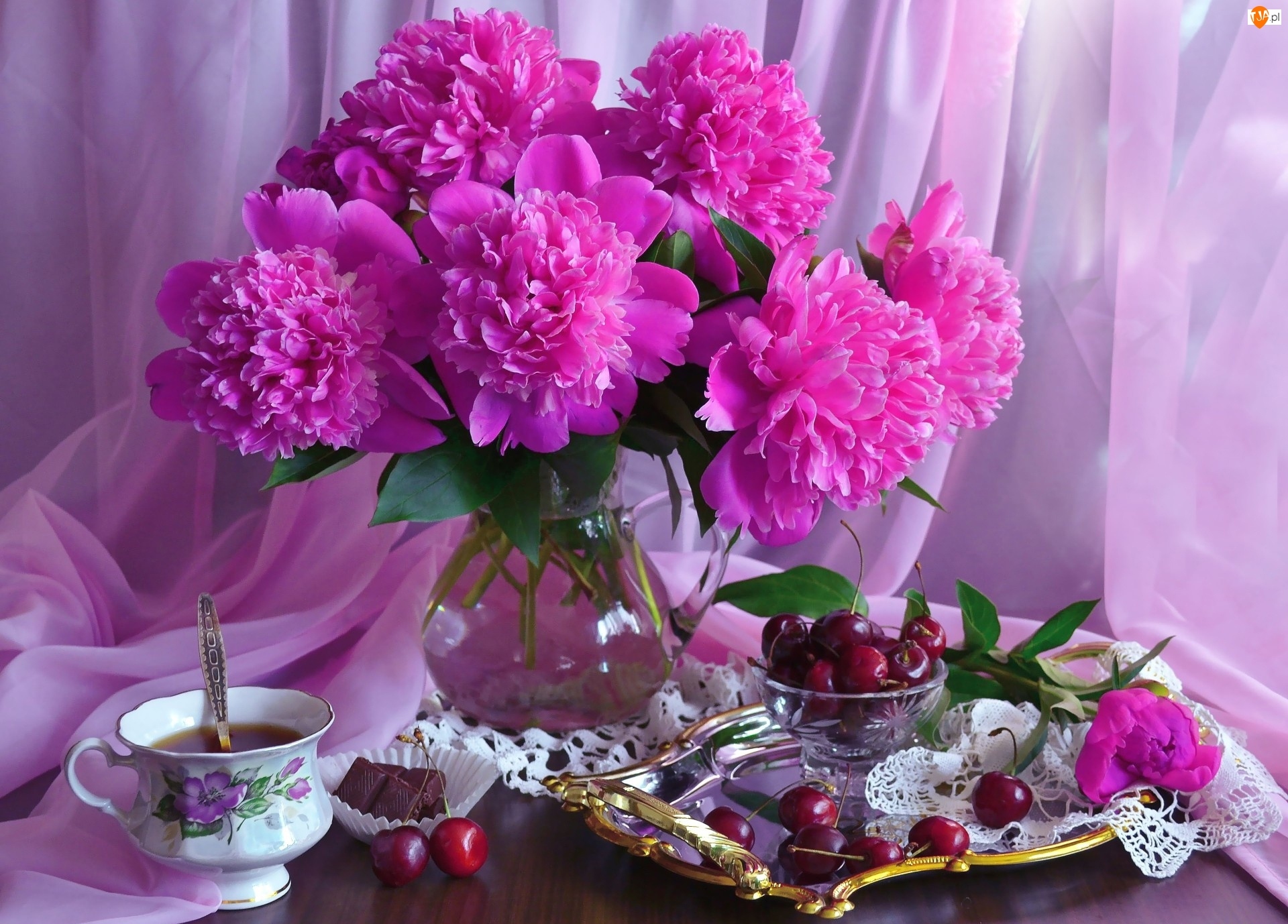 Czereśnie, Herbaty, Bukiet, Kompozycja, Piwonii, Filiżanka