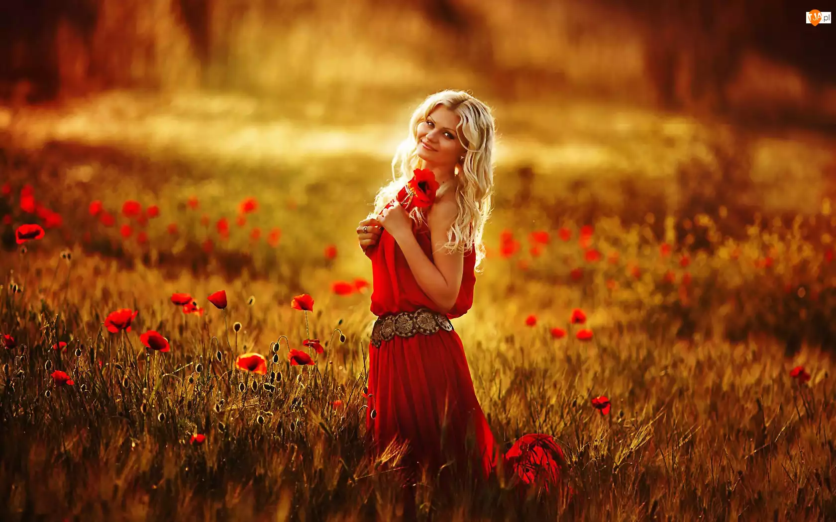 Maki, Blondynka, Sukienka, Łąka, Czerwona, Styl, Moda