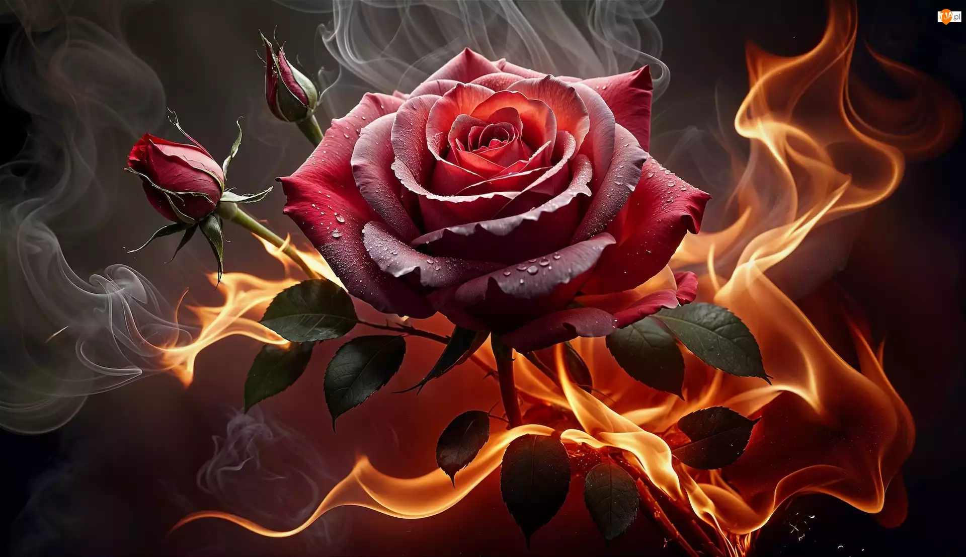 Czerwona róża z pąkiem w płomieniach ognia