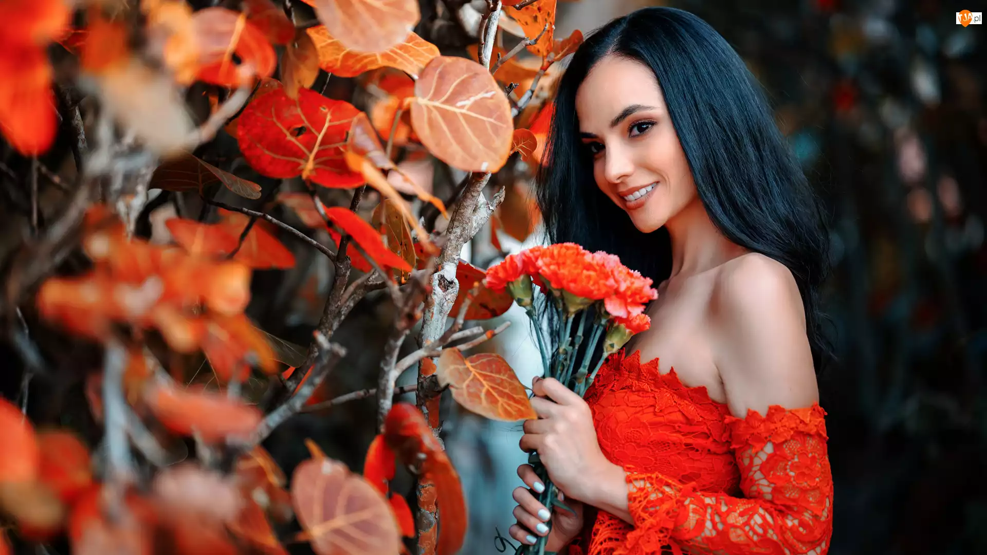 Czerwona, Sukienka, Goździki, Dziewczyna, Bukiet, Liście, Jesień