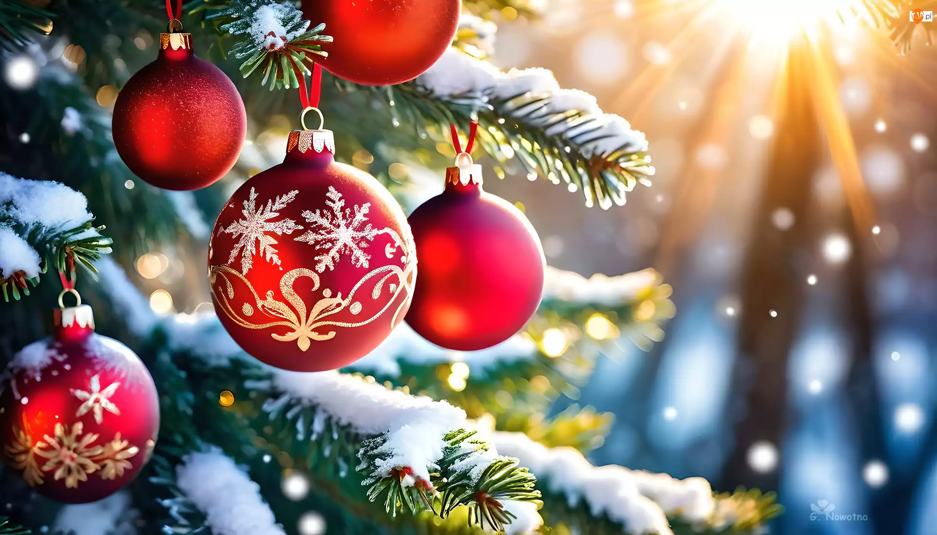 Czerwone, Boże Narodzenie, Choinka, Grafika, Bombki, Śnieg