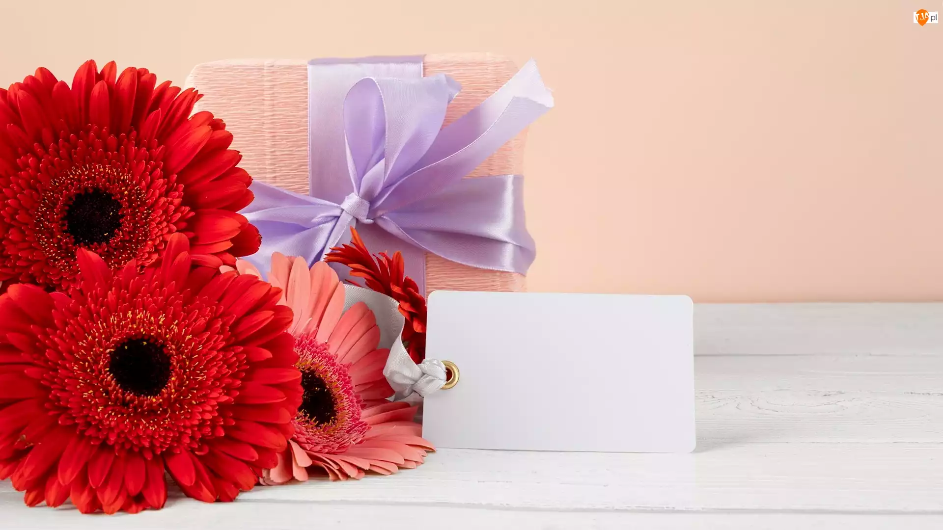 Czerwone gerbery obok prezentu z kokardą i bileci