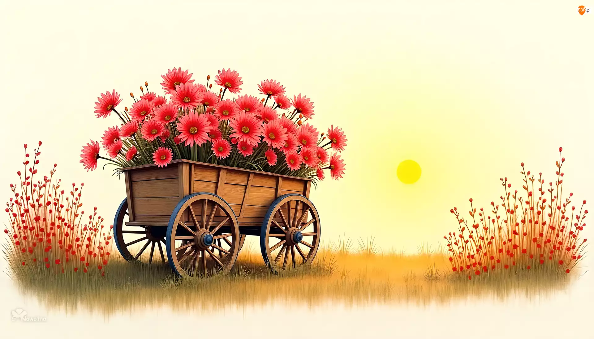 Czerwone, Grafika, Wózek, Drewniany, Kwiaty