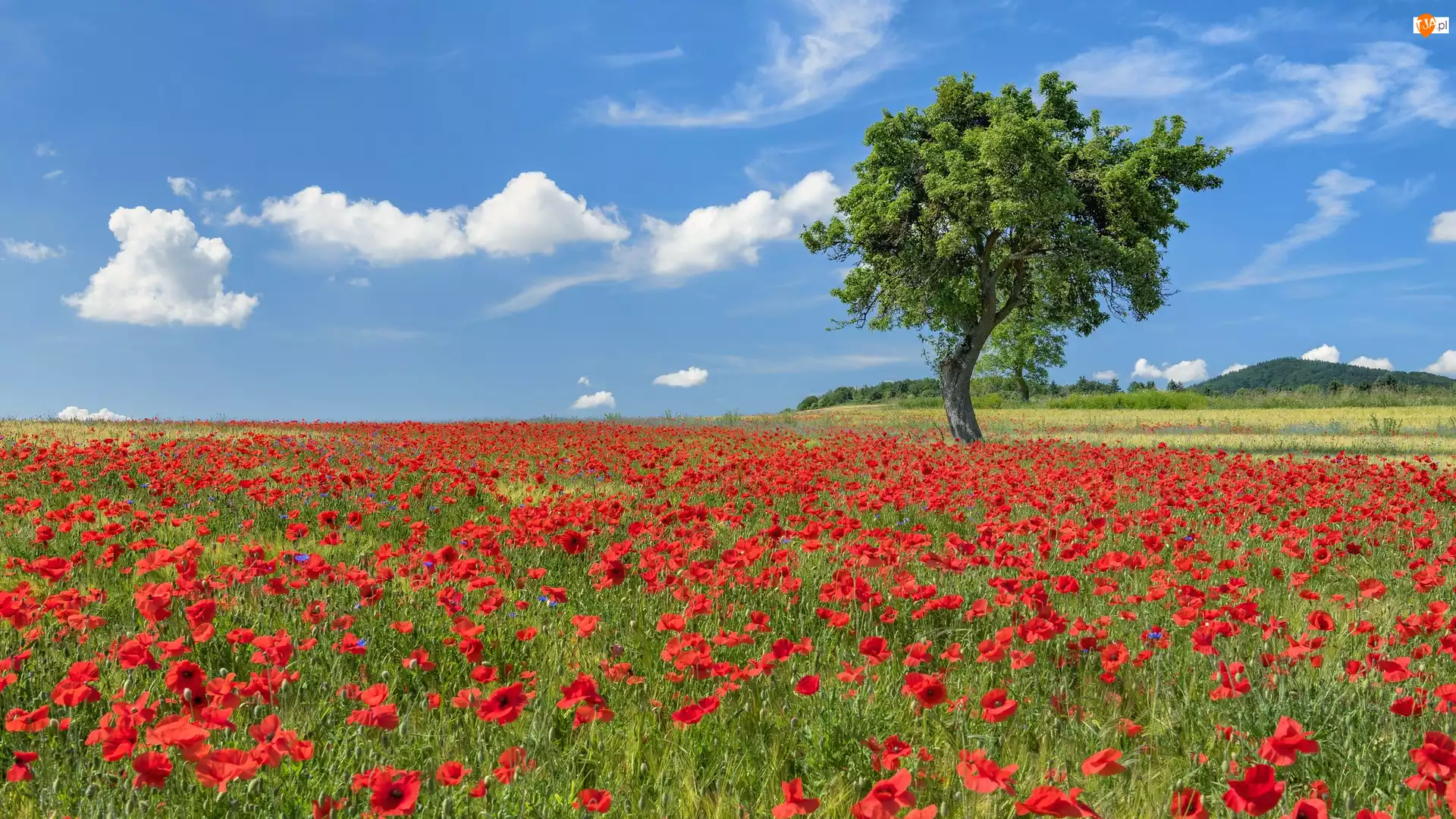 Czerwone, Pole, Drzewo, Obloki, Maki, Niebo