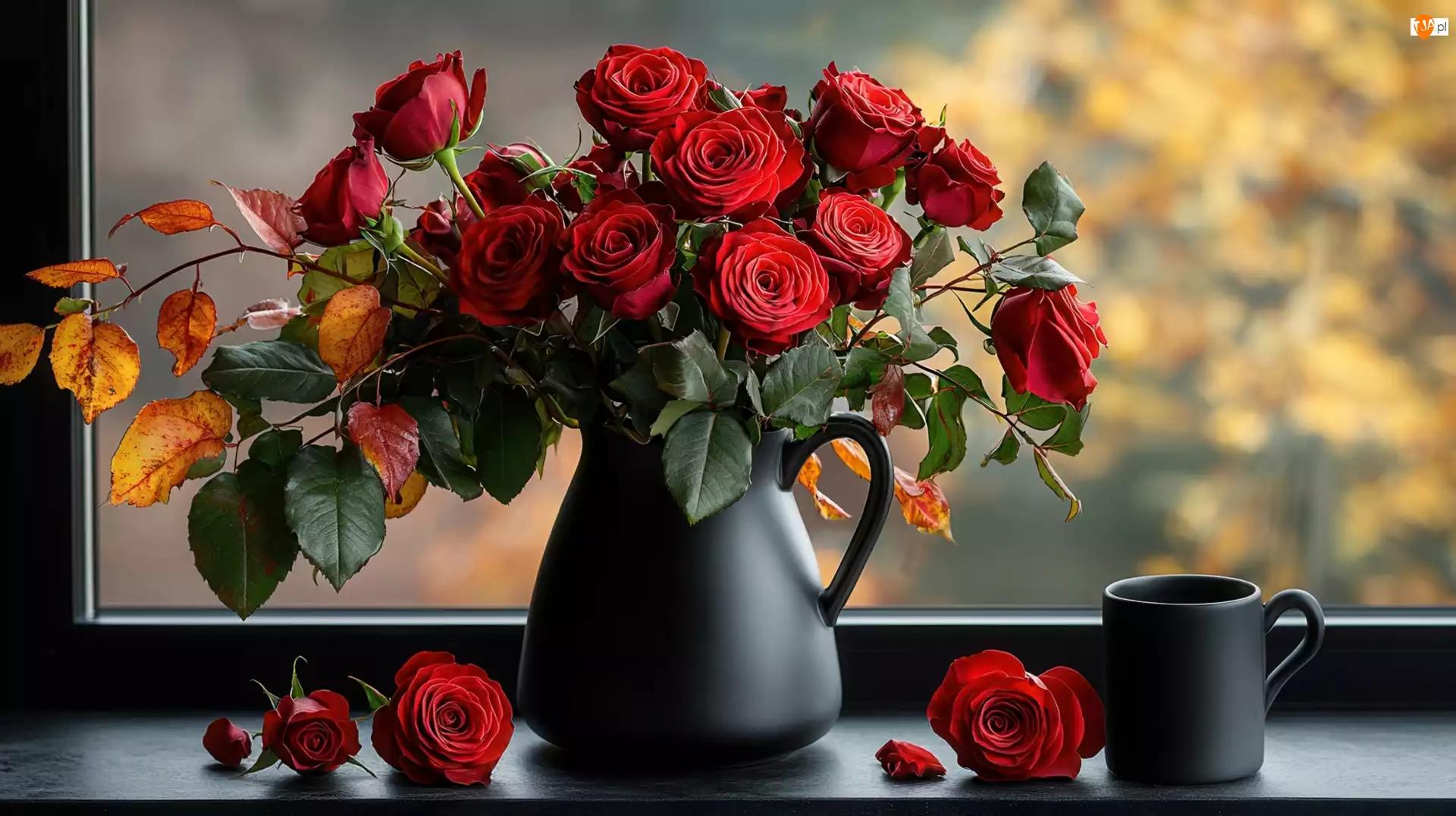 Róże, Jesienne, Kubek, Czerwone, Okno, Dzbanek, Liście