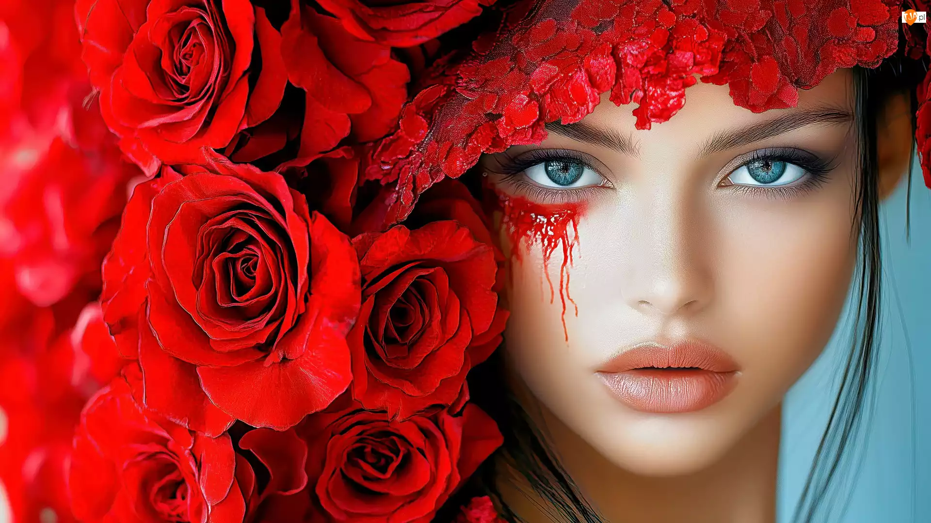 Czerwone, Grafika, Makijaż, Dziewczyna, Róże