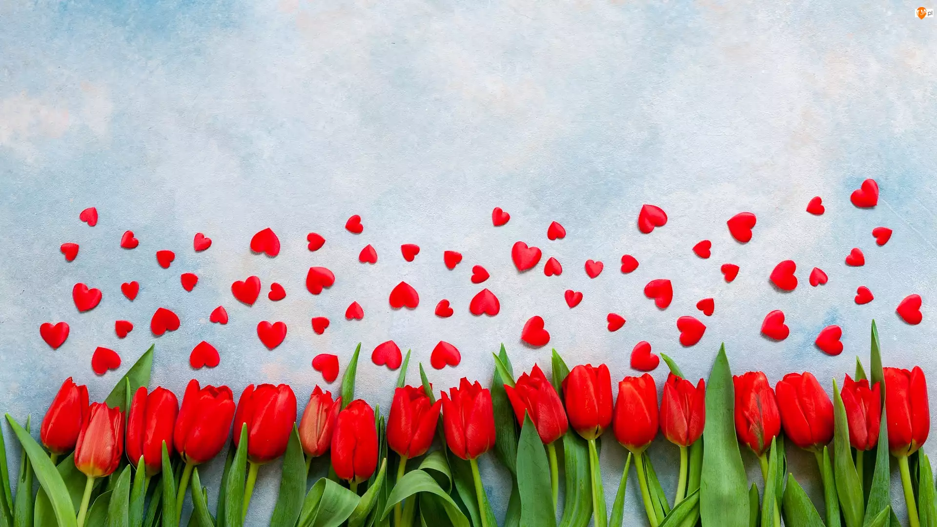 Serduszka, Tło, Tulipany, Czerwone, Biało-niebieskie