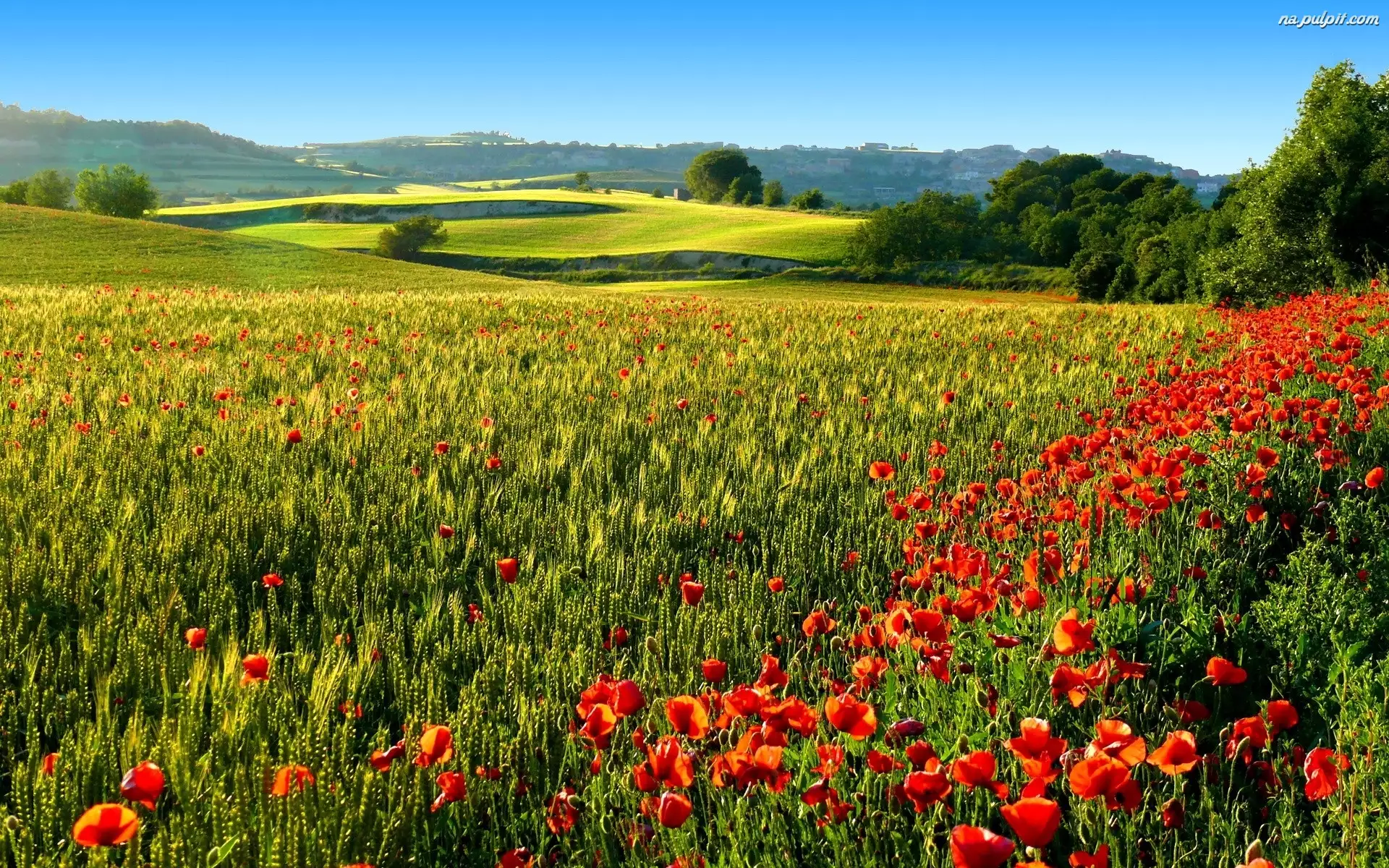 Czerwone, Wzgórza, Pole, Drzewa, Kłosy, Maki