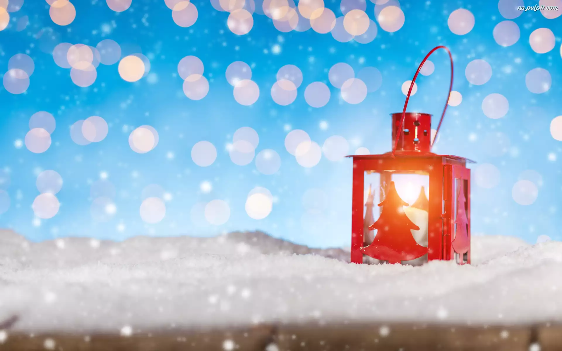 Lampion, Bokeh, Świąteczny, Czerwony, Śnieg