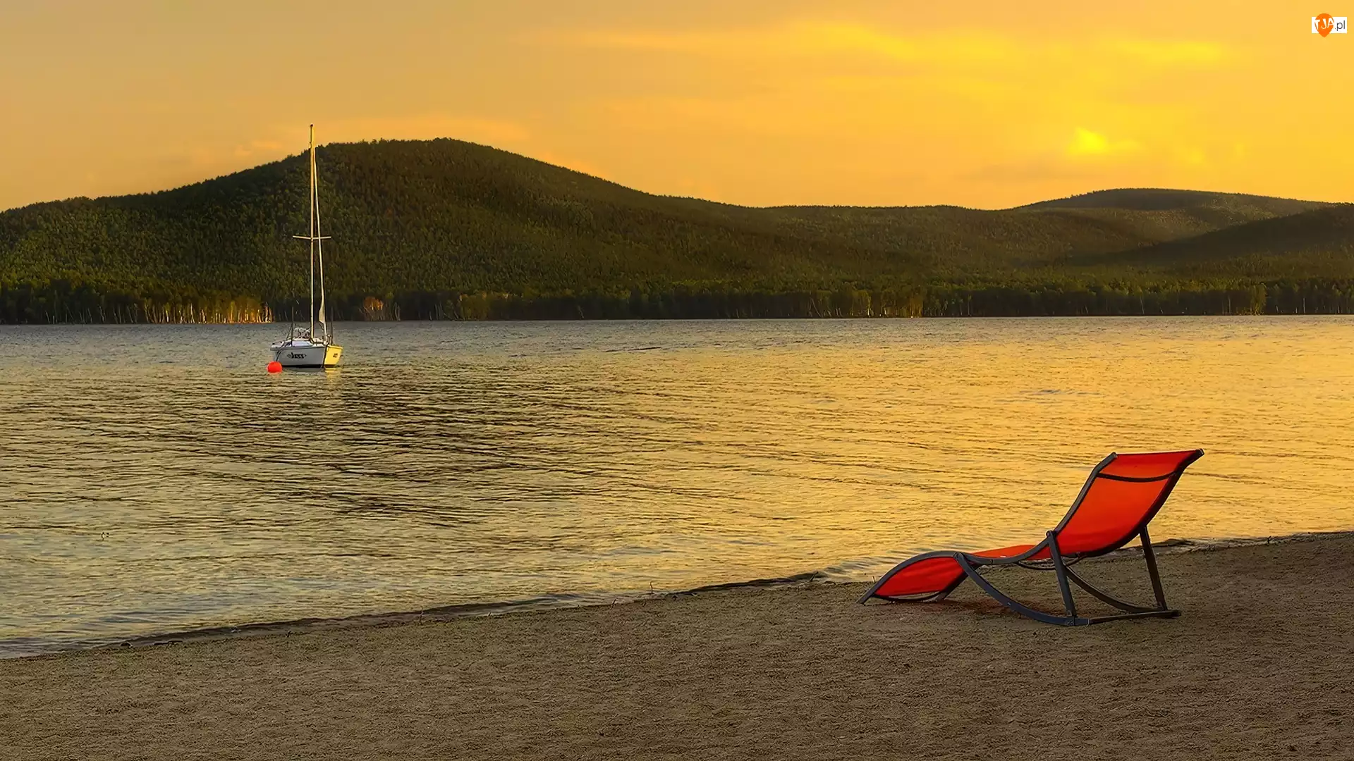 Leżak, Czerwony, Plaża, Wakacje, Jezioro, Żaglówka