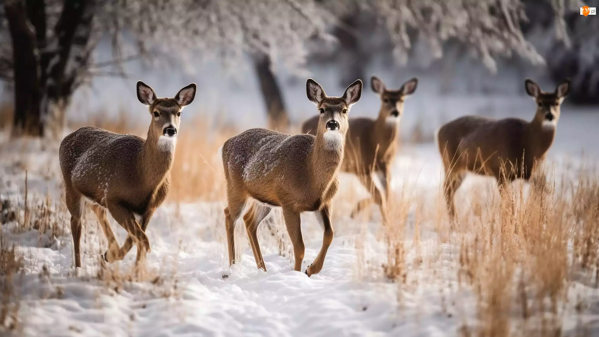 Cztery, Zima, Śnieg, Rośliny, Sarny, Suche