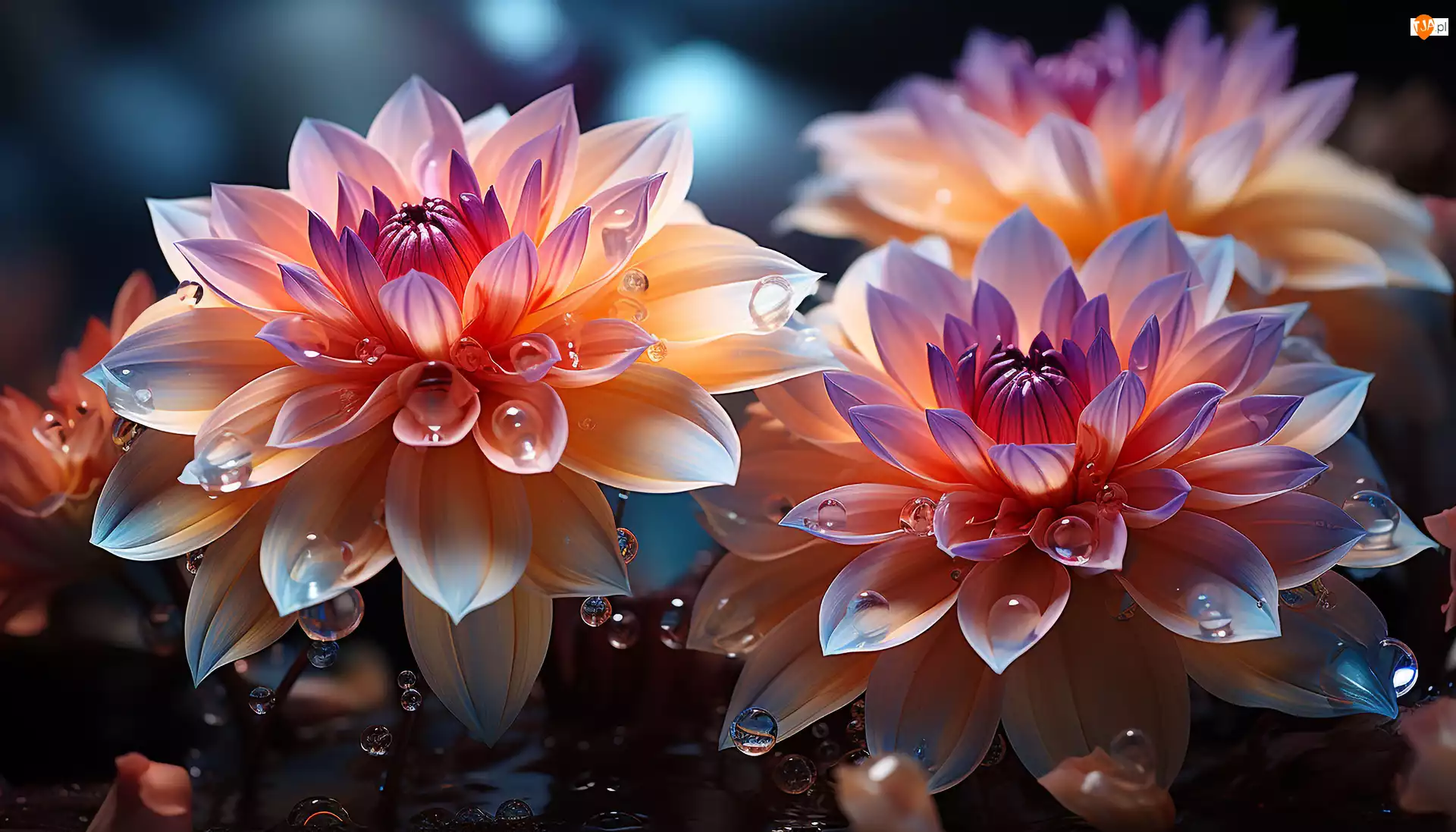 Dalie, Grafika, Kwiaty, Kolorowe, Krople