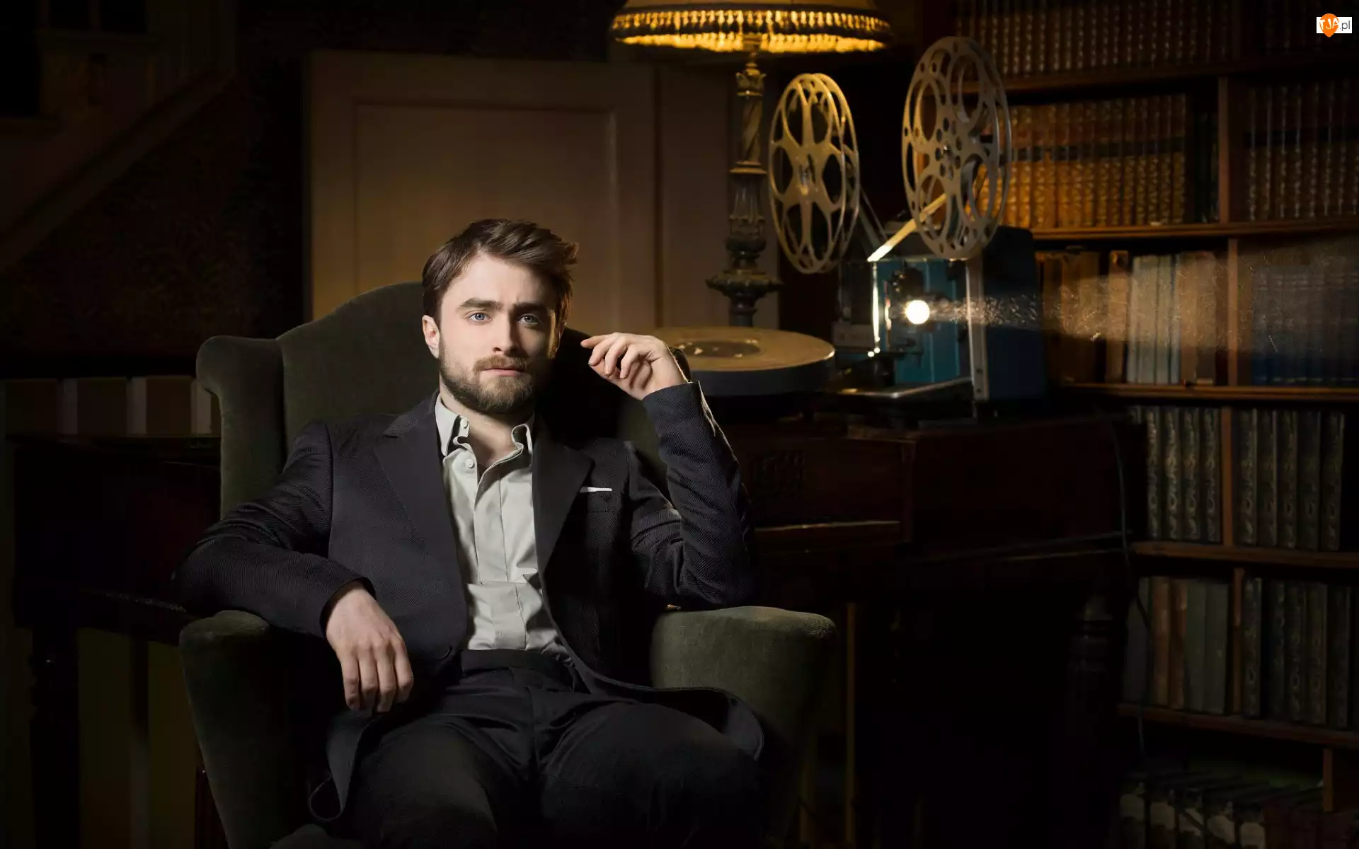 Daniel Radcliffe siedzący na fotelu przy starym p