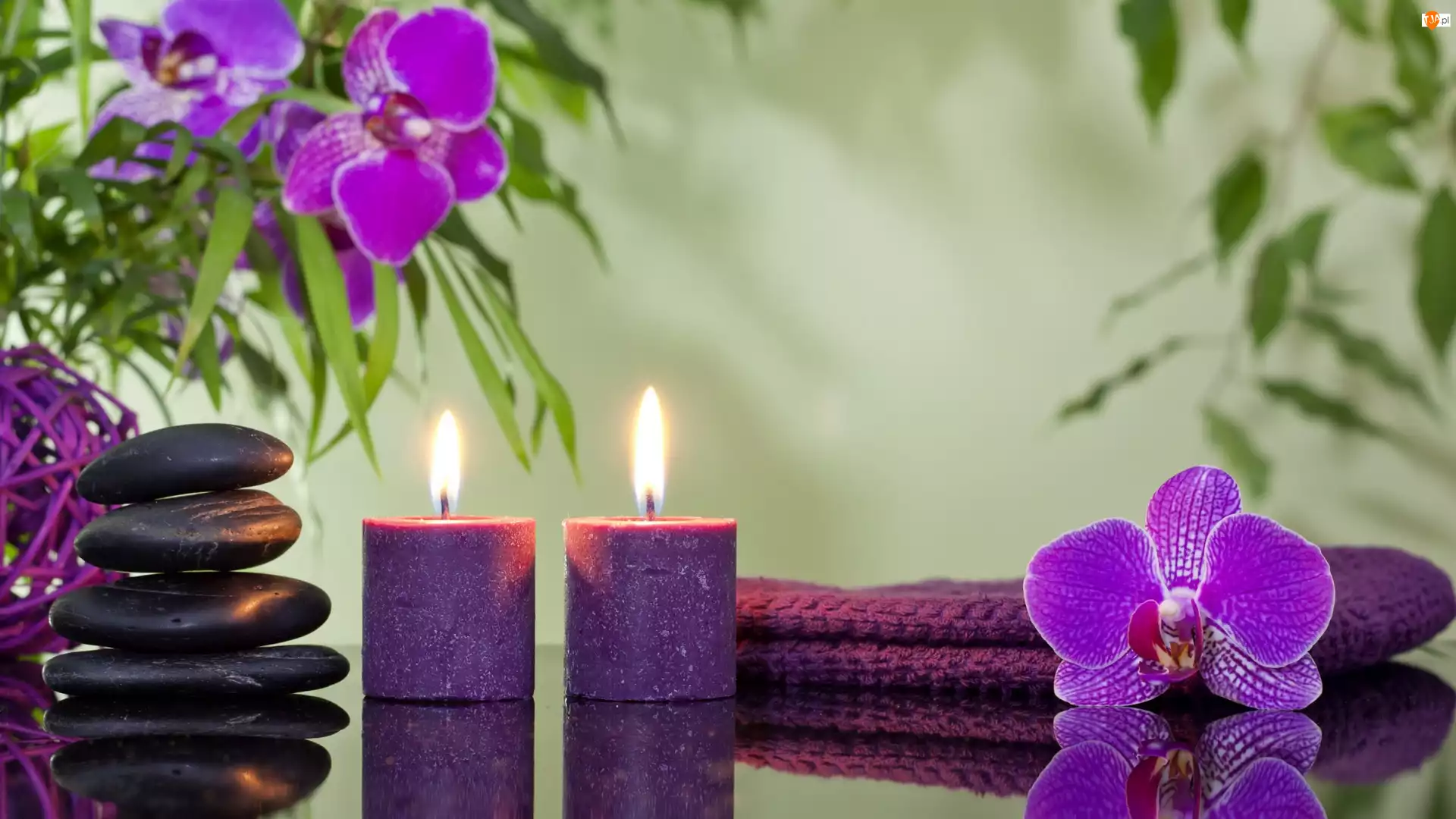 Świece, Storczyki, SPA, Kompozycja, Kamienie, Fioletowe, Dwie