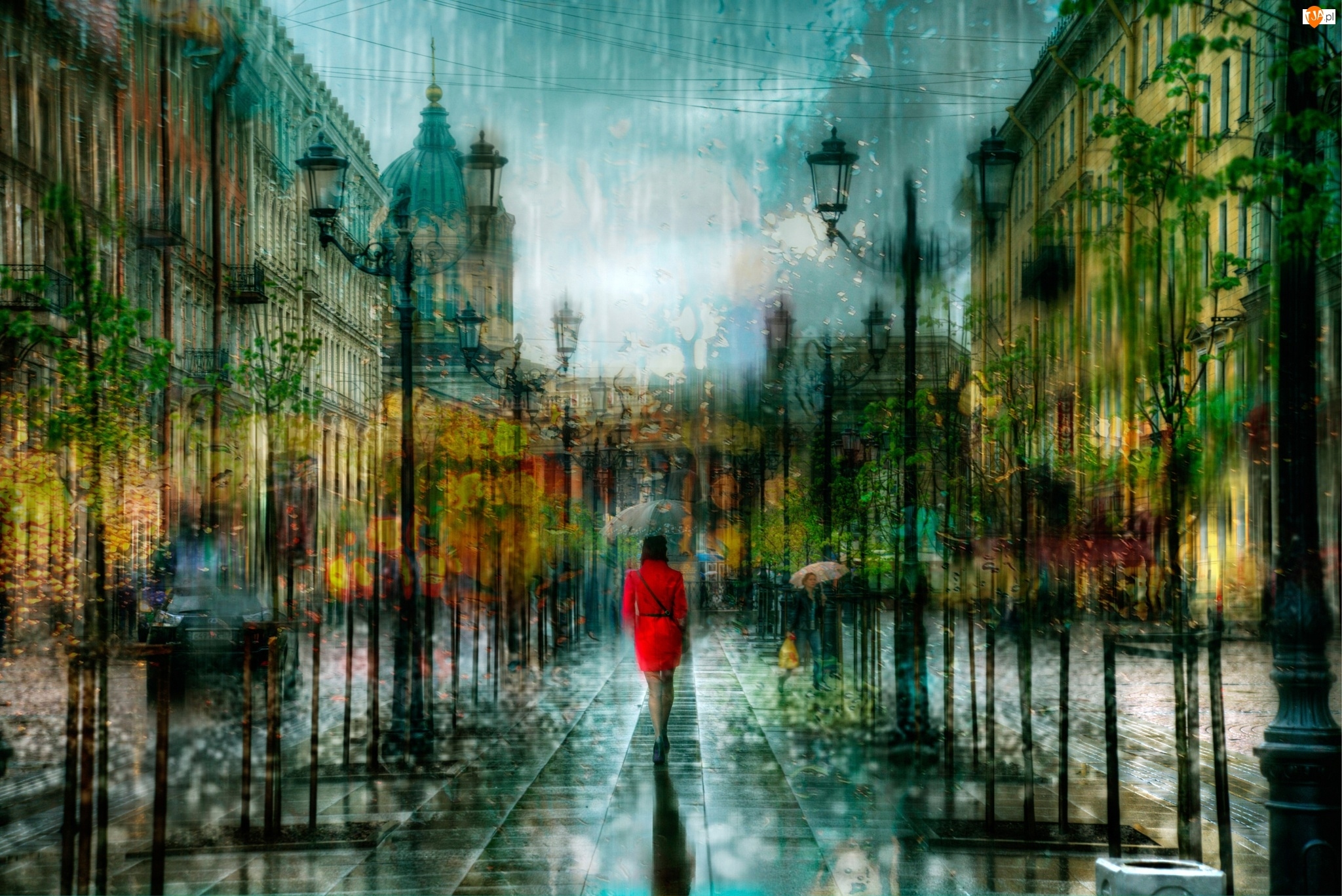 Domy, Kobieta, Miasto, Deszcz