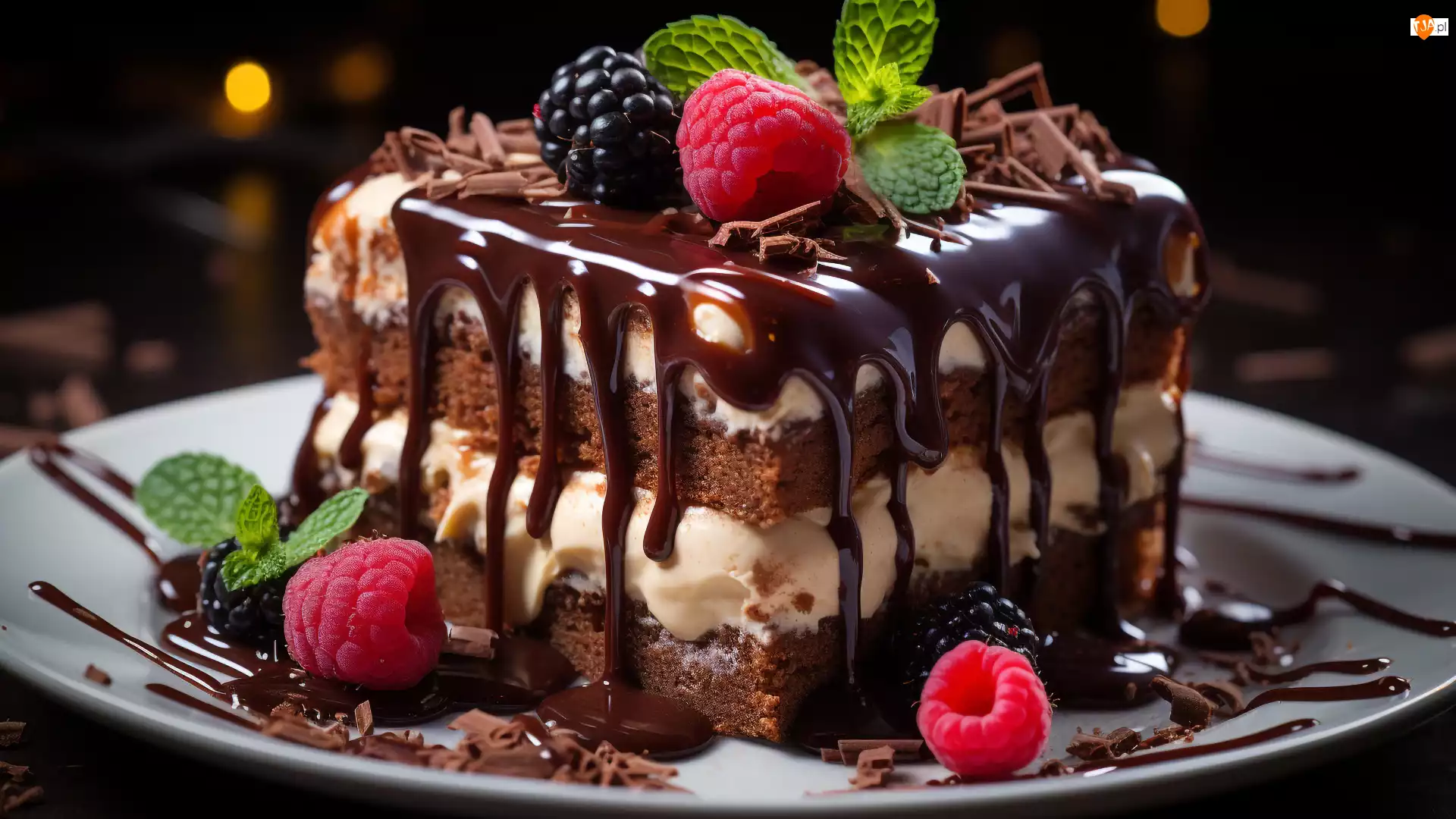 Deser, Listki, Mięty, Jeżyny, Czekoladowe, Ciasto, Polewa, Krem, Maliny, Talerz