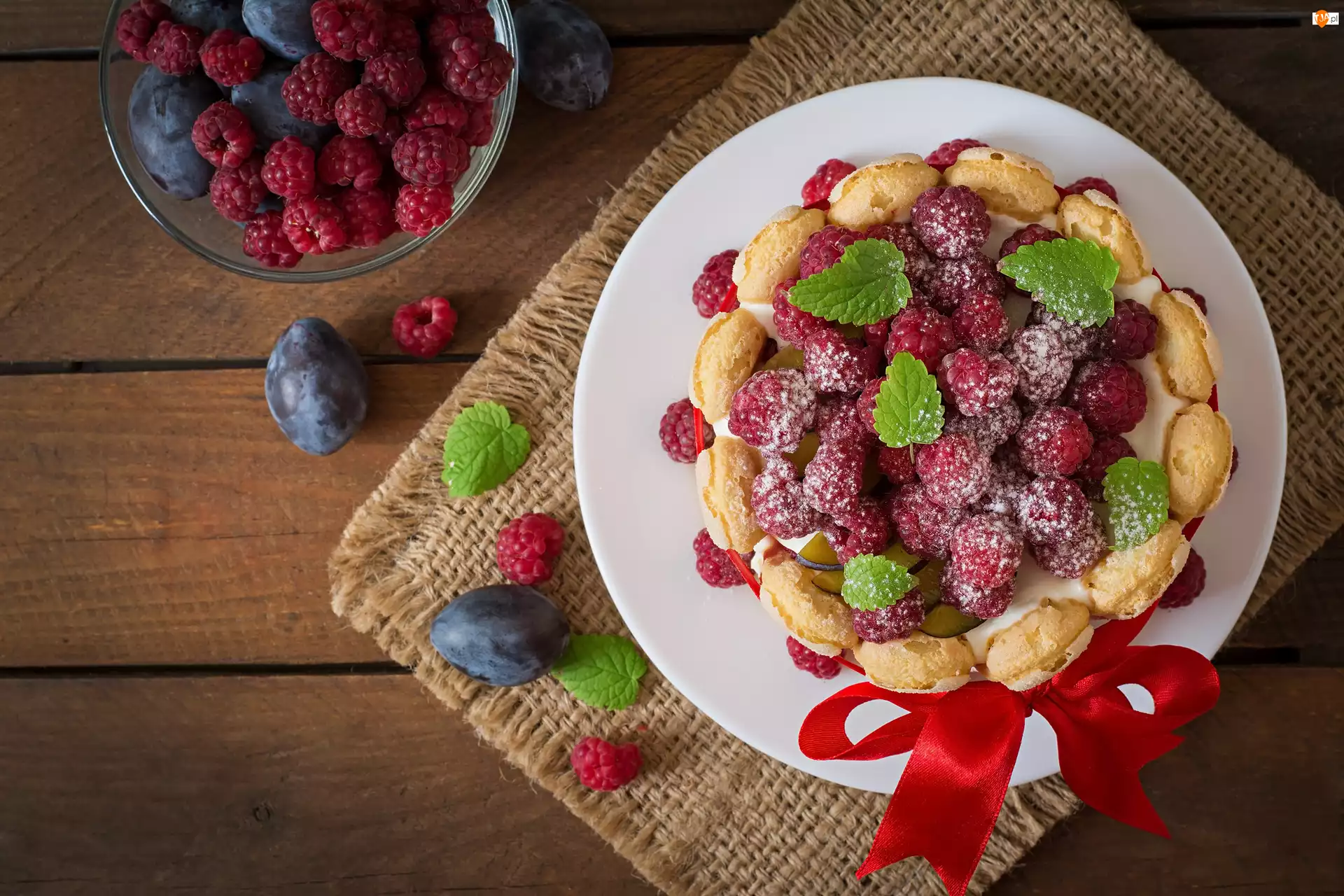Serwetka, Talerz, Kokardka, Mięta, Deser, Owoce