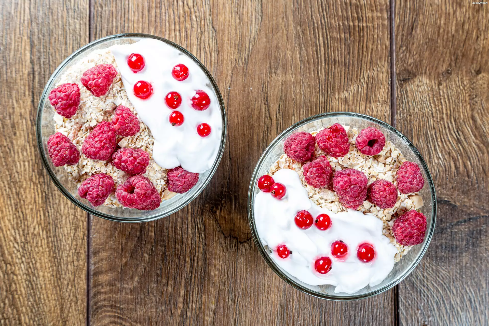 Deski, Musli, Miseczki, Czerwone, Śmietana, Owoce, Maliny, Śniadanie, Porzeczki