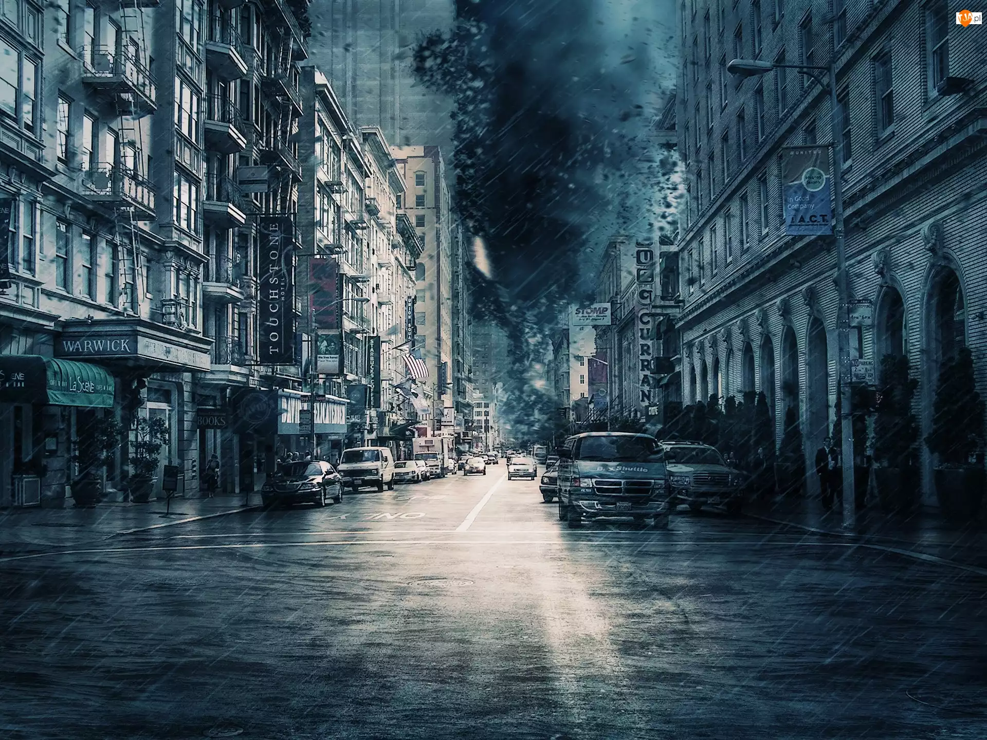 Samochody, Deszcz, Ulica, Miasto, Domy