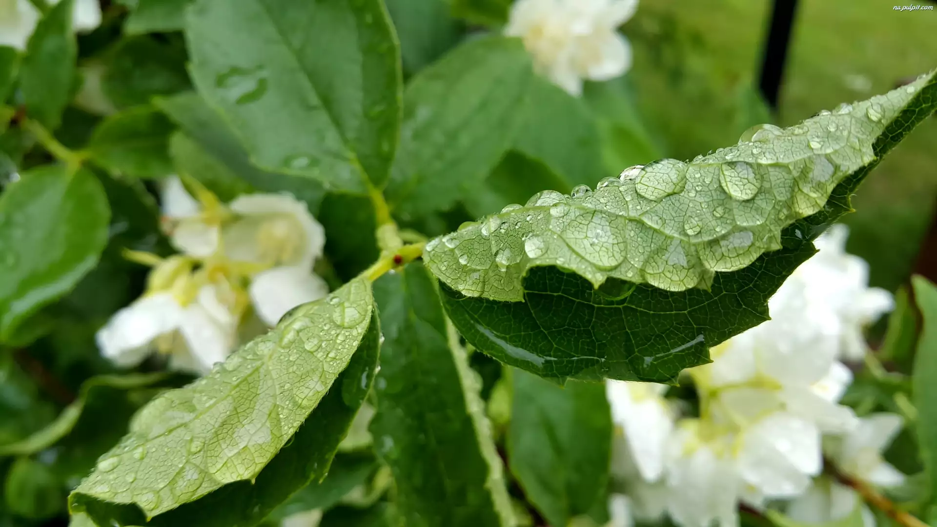 Deszczu, Kwiaty, Listki, Jaśminu, Krople