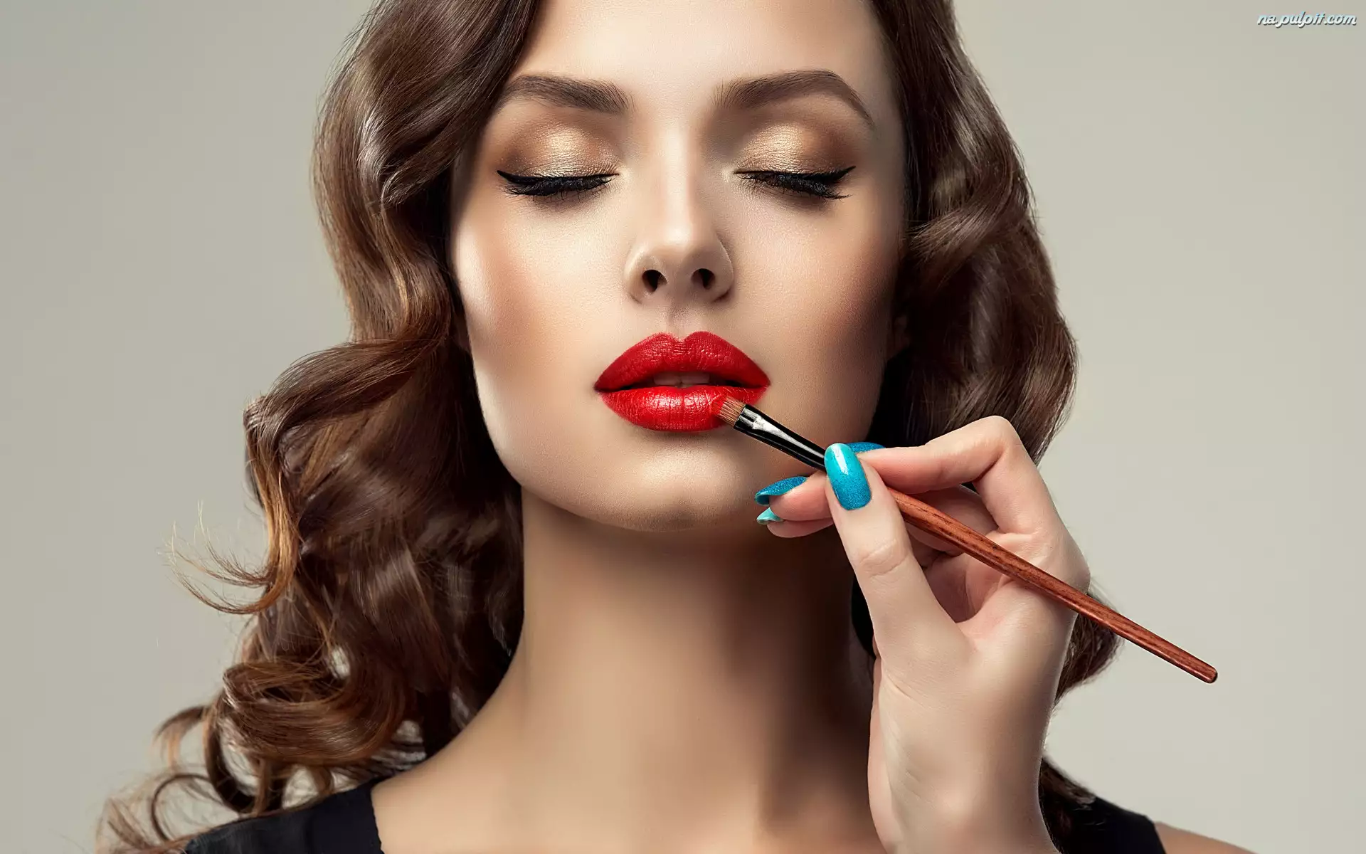 Szminka, Kobieta, Makijaż, Pędzel, Szatynka, Usta, Dłoń, Twarz