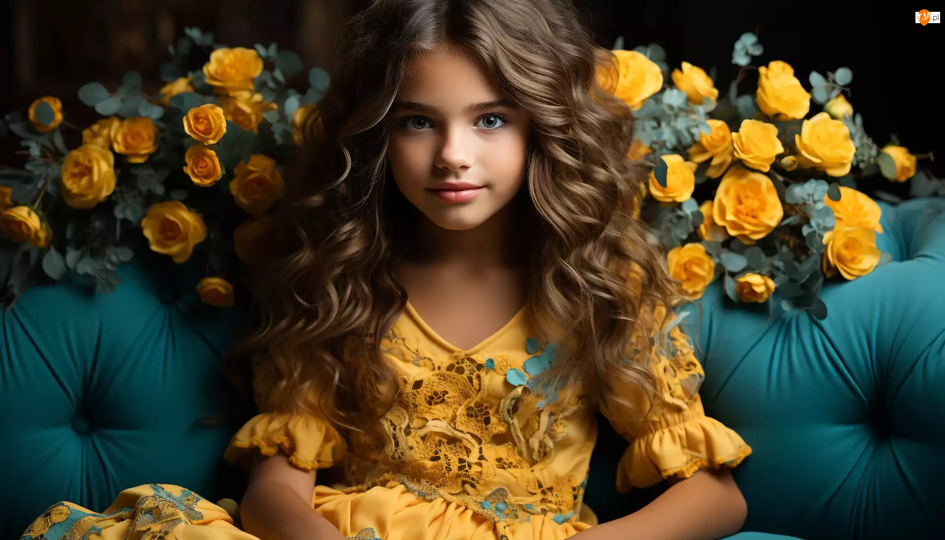 Długie, Dziewczynka, Żółta, Kwiaty, Włosy, Sukienka