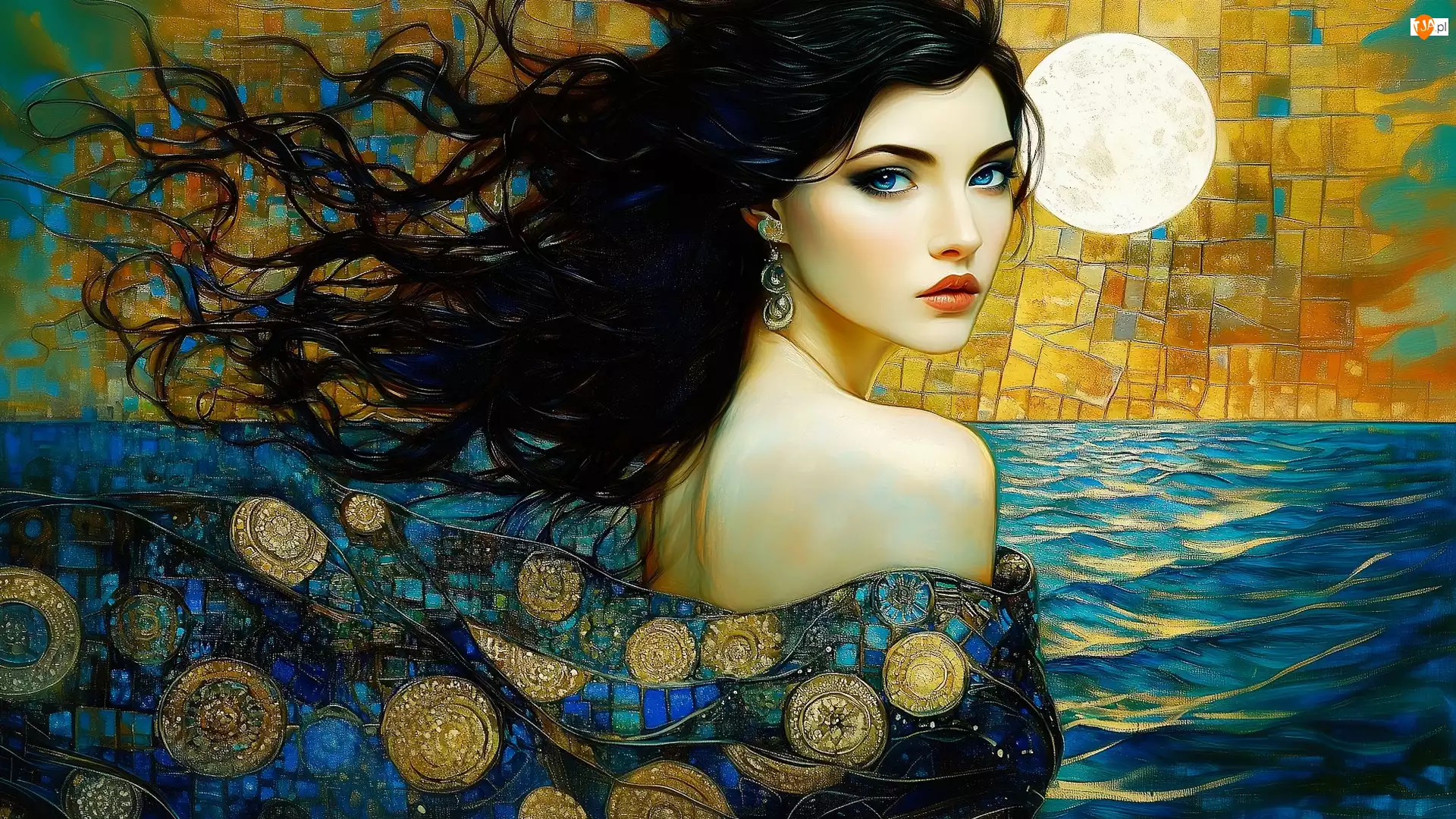 Brunetka, Dziewczyna, Woda, Grafika, Kolczyki, Księżyc