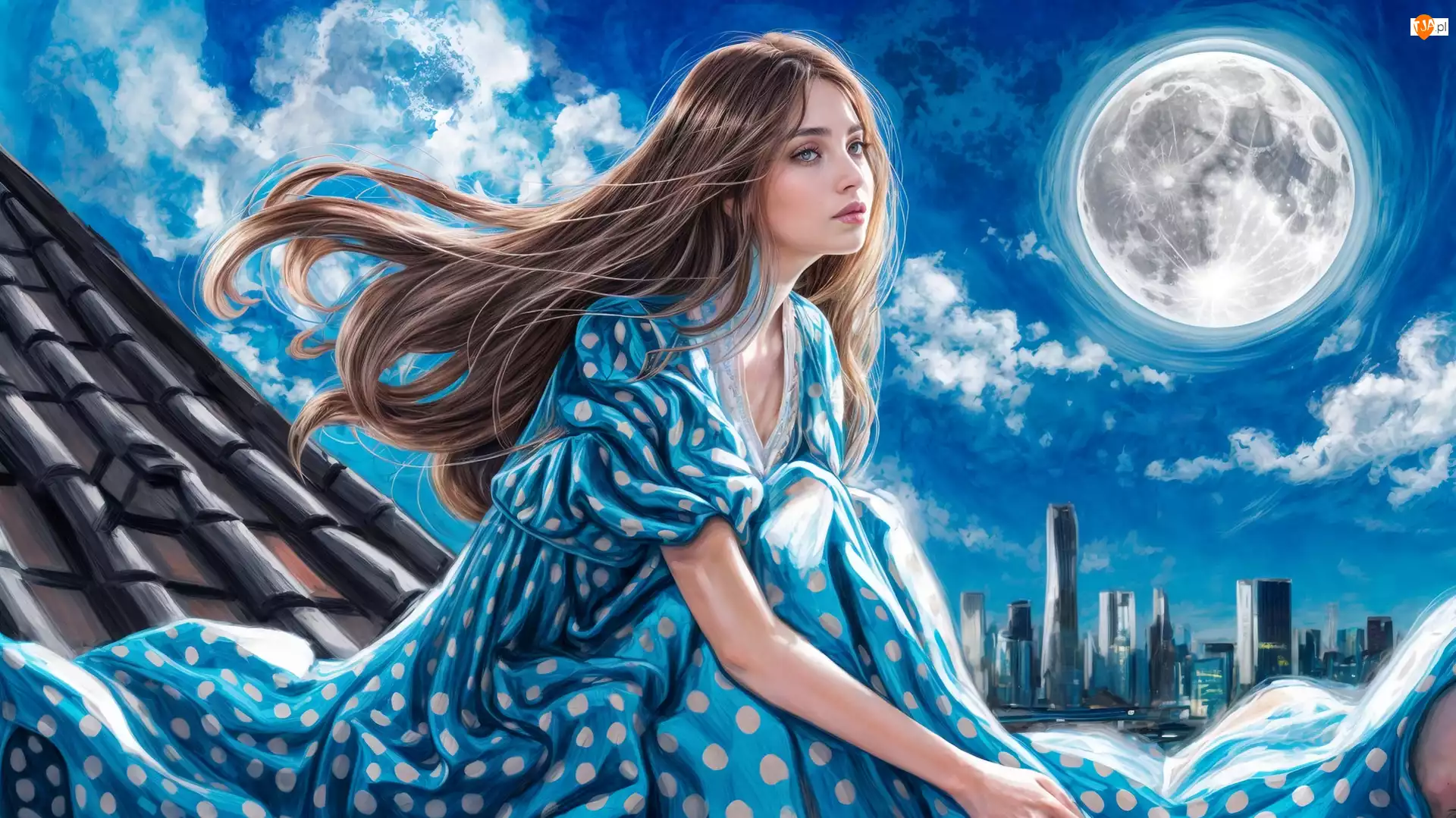 Długowłosa dziewczyna na dachu domu na tle pełn