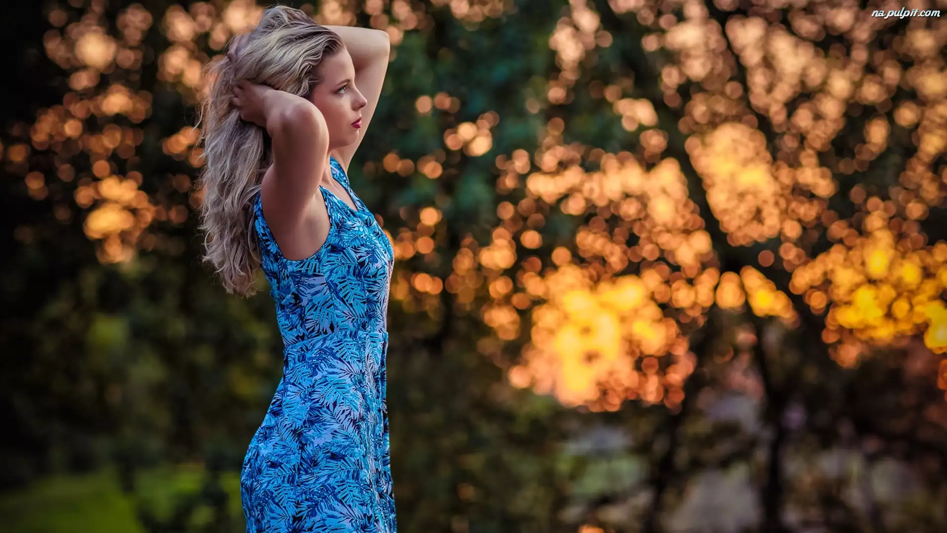 Sukienka, Długowłosa, Blondynka, Kobieta, Niebieska