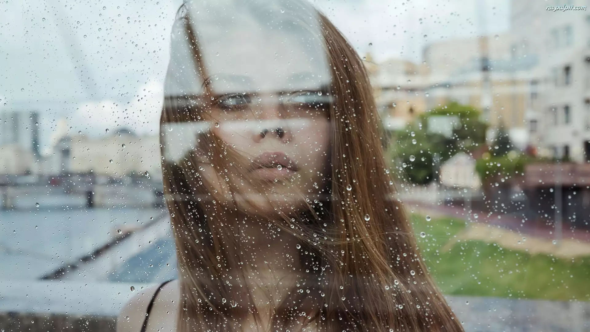 Kobieta, Długowłosa, Szyba, Deszcz, Twarz, Krople