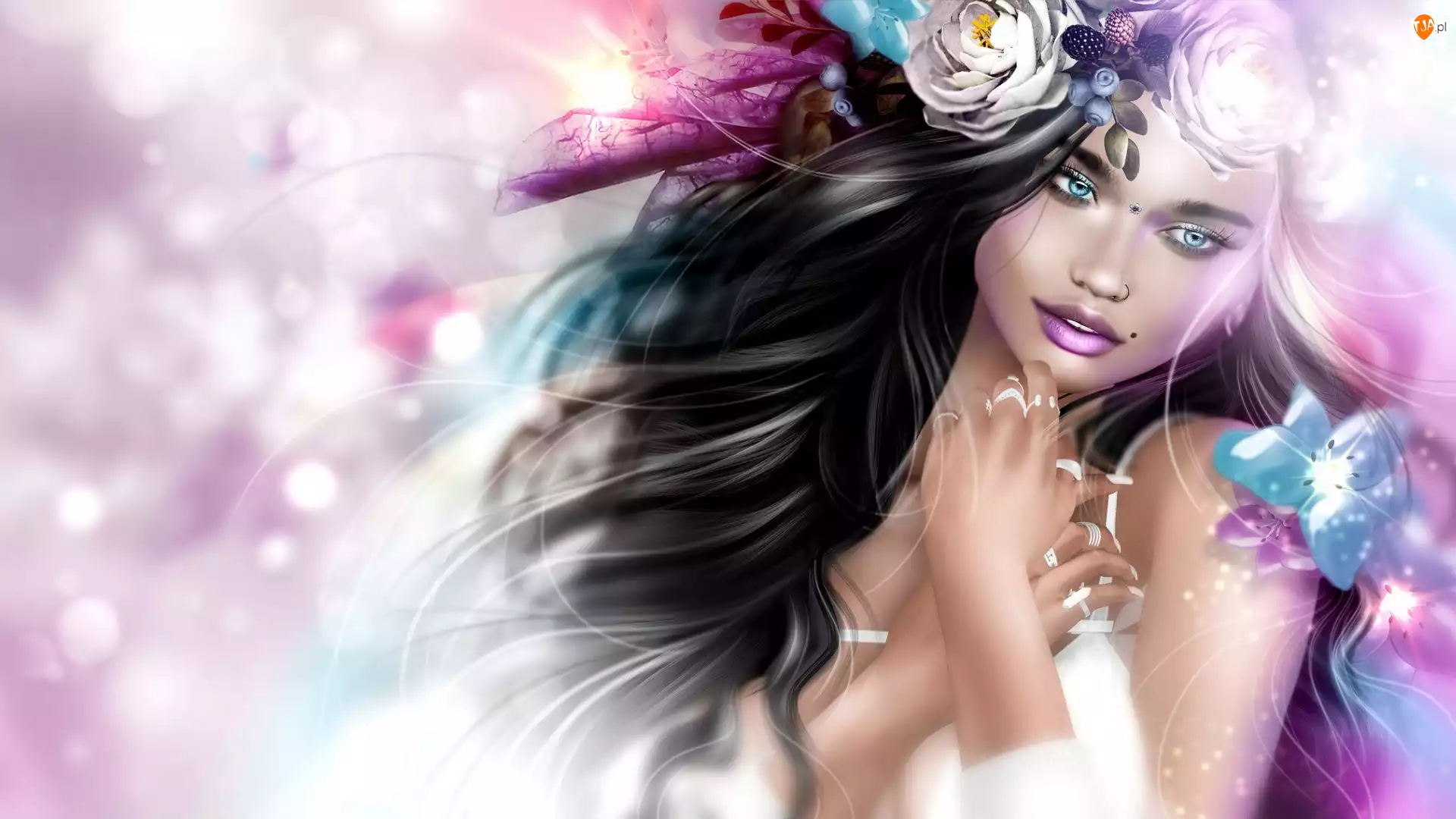 Włosy, Grafika, Długie, Kobieta, Kwiaty