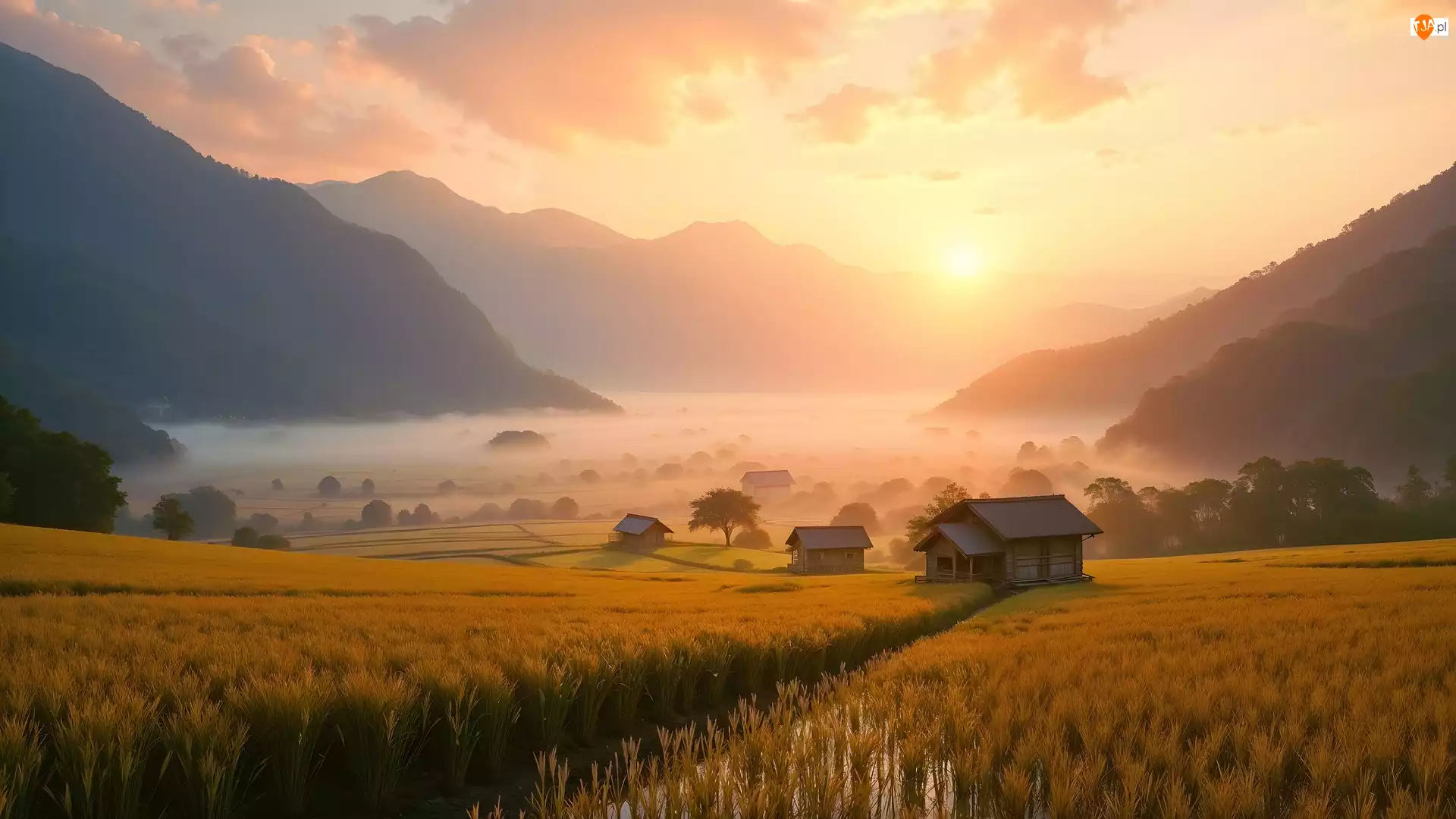 Dolina, Góry, AI, Pola, Drzewa, Mgła, Domy